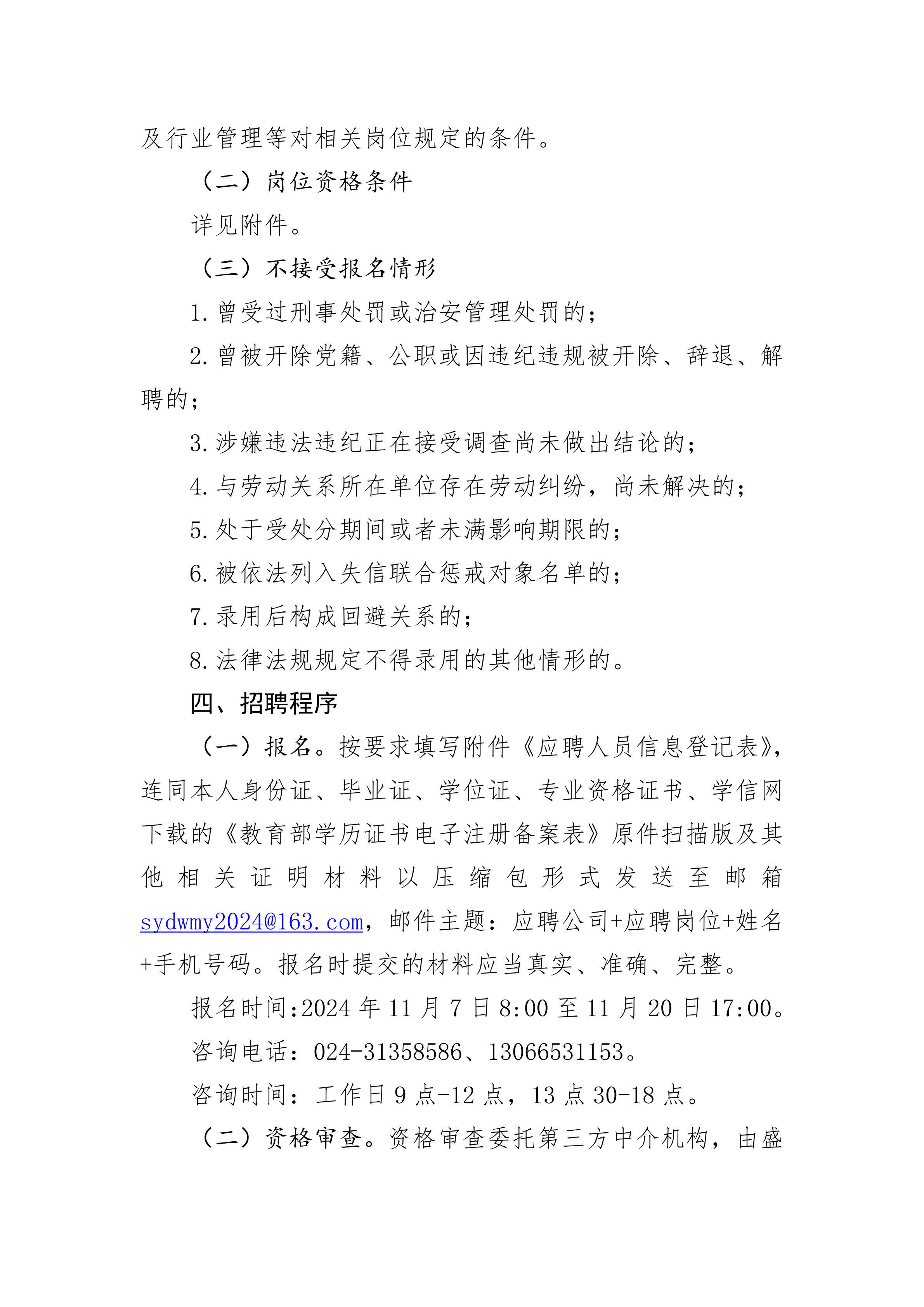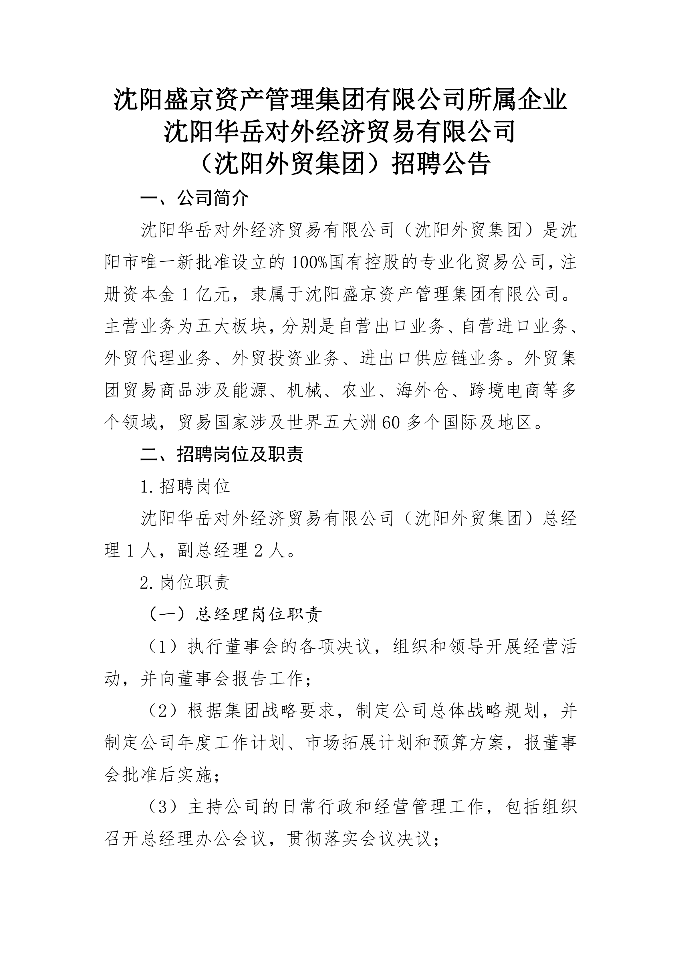 沈阳盛京资产管理集团有限公司所属企业沈阳华岳对外经济贸易有限公司 (沈阳外贸集团)招聘公告 文章来源:沈阳市国资委 发布于:2024-11-07 附件1招聘岗位信息表.pdf附件2应聘人员信息登记表.pdf