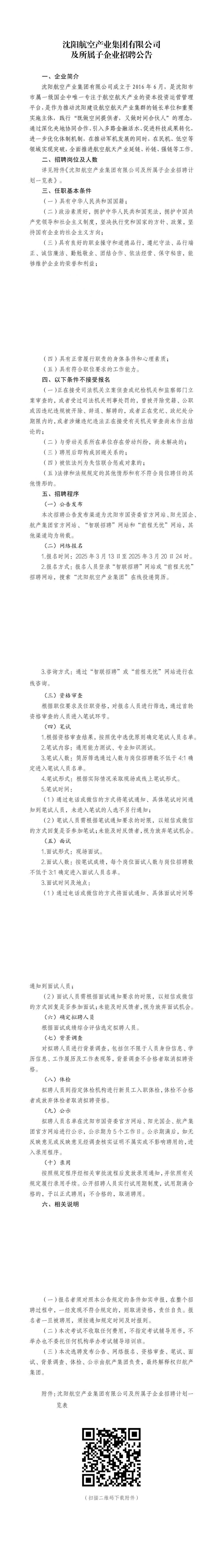沈阳航空产业集团有限公司及所属子企业招聘公告