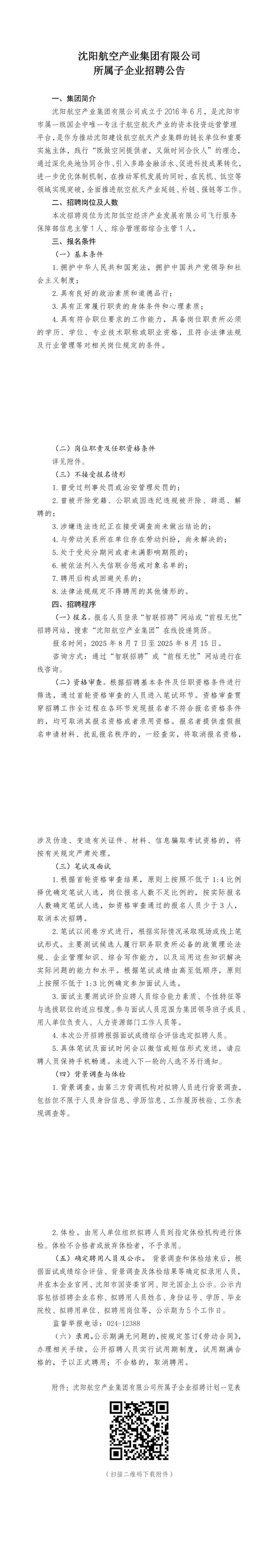 沈阳航空产业集团有限公司所属子企业招聘公告