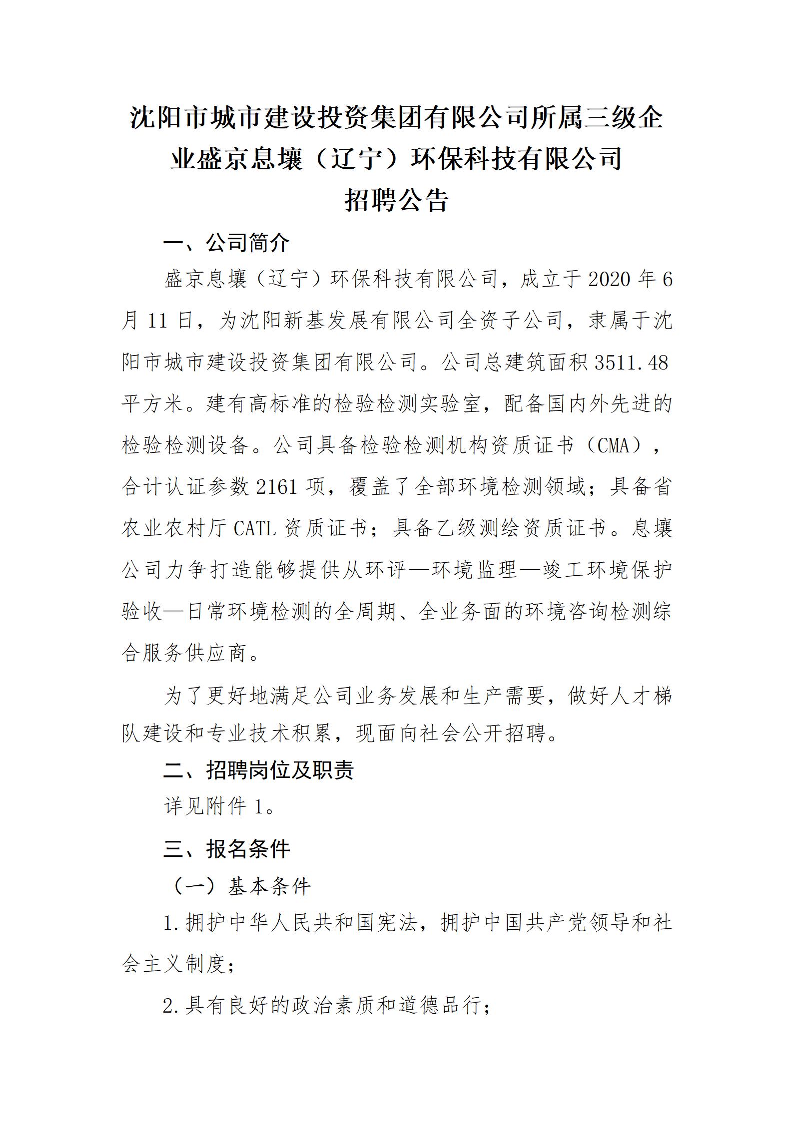 沈阳市城市建设投资集团有限公司所属三级企业盛京息壤(辽宁)环保科技有限公司招聘公告 文章来源:沈阳市国资委 发布于:2025-08-07 附件1 盛京息壤(辽宁)环保科技有限公司招聘公告招聘岗位信息表.xlsx附件2 应聘申请表.docx