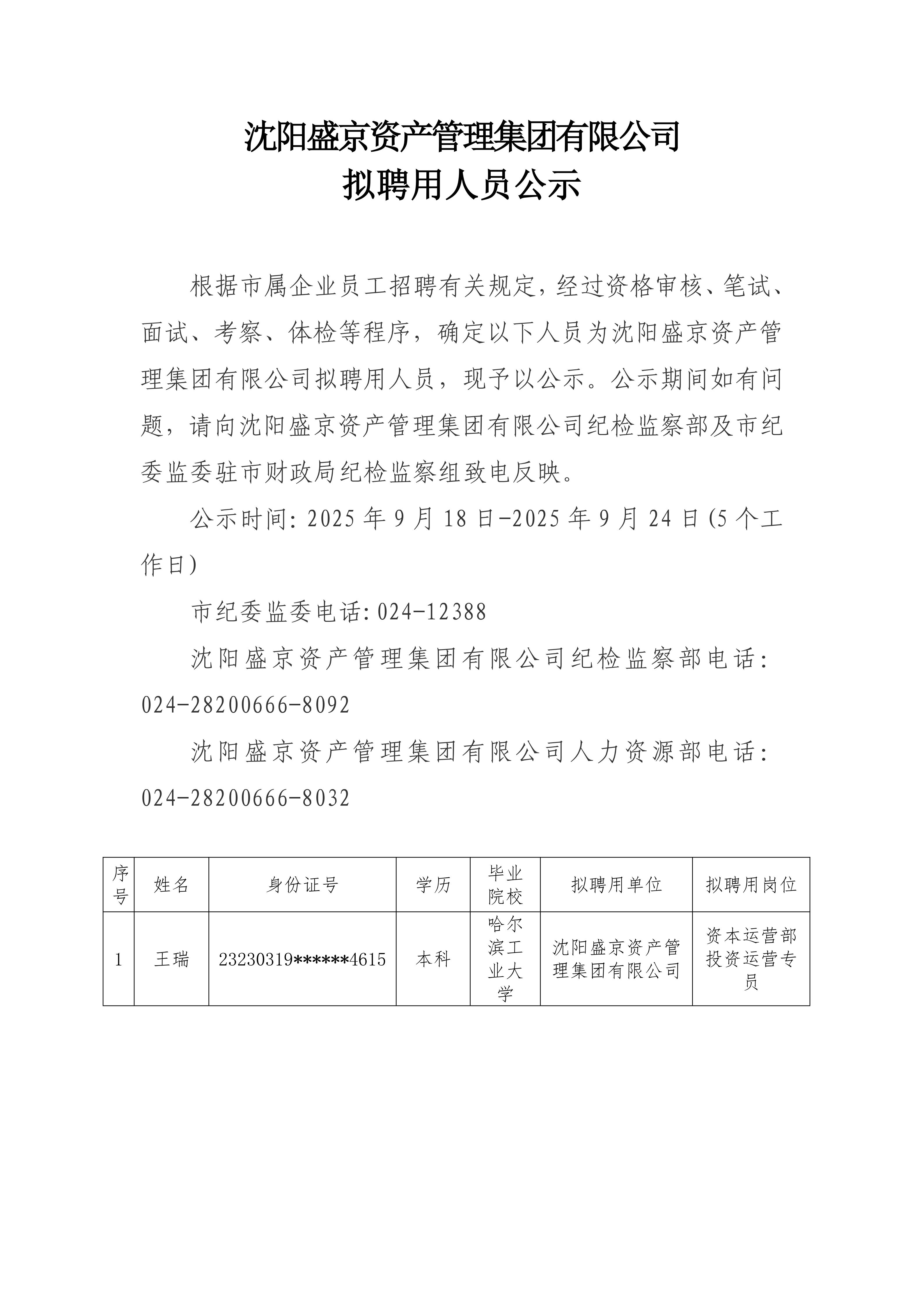 沈阳盛京资产管理集团有限公司拟聘用人员公示