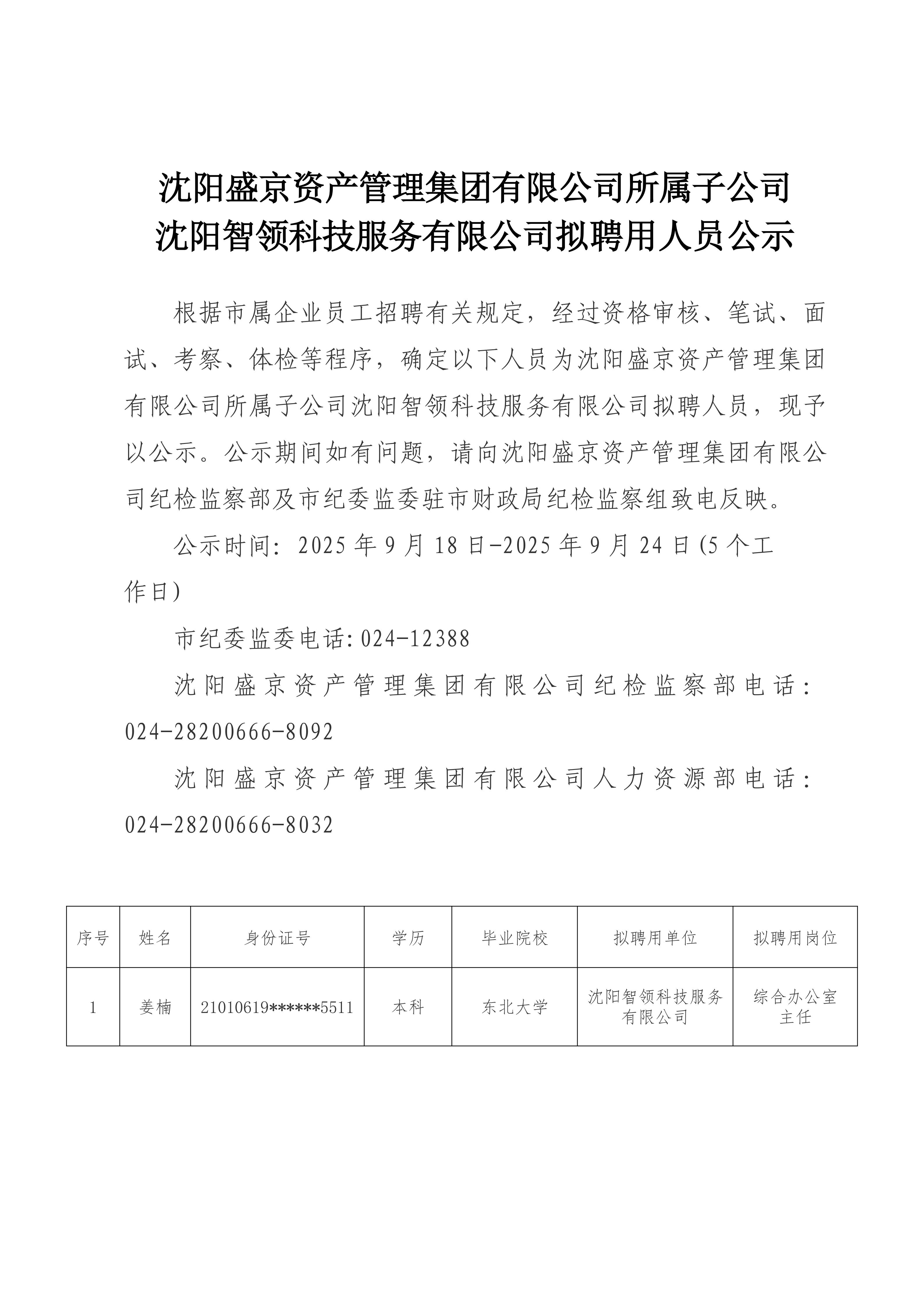 沈阳盛京资产管理集团有限公司所属子公司沈阳智领科技服务有限公司拟聘用人员公示