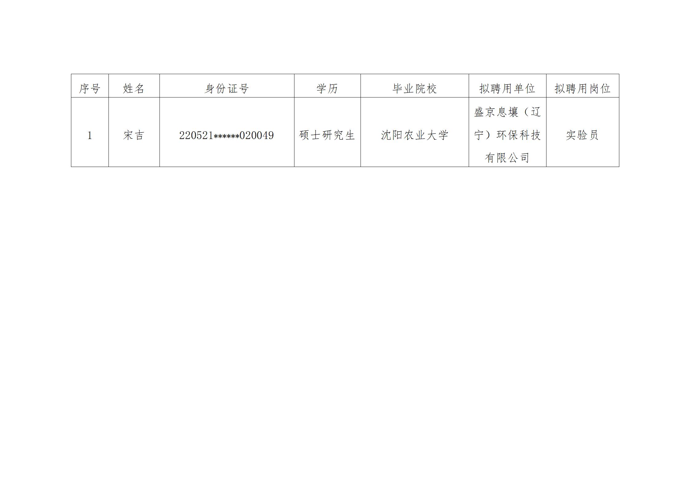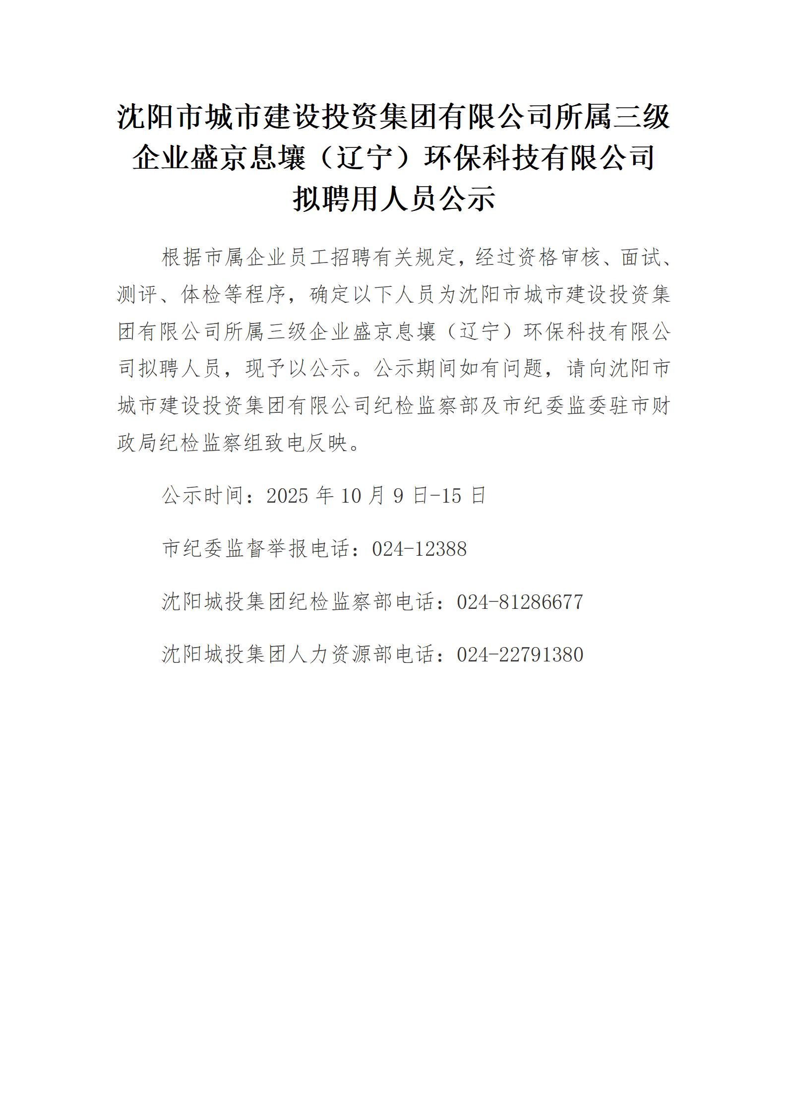 沈阳市城市建设投资集团有限公司所属三级子公司盛京息壤(辽宁)环保科技有限公司拟聘用人员公示