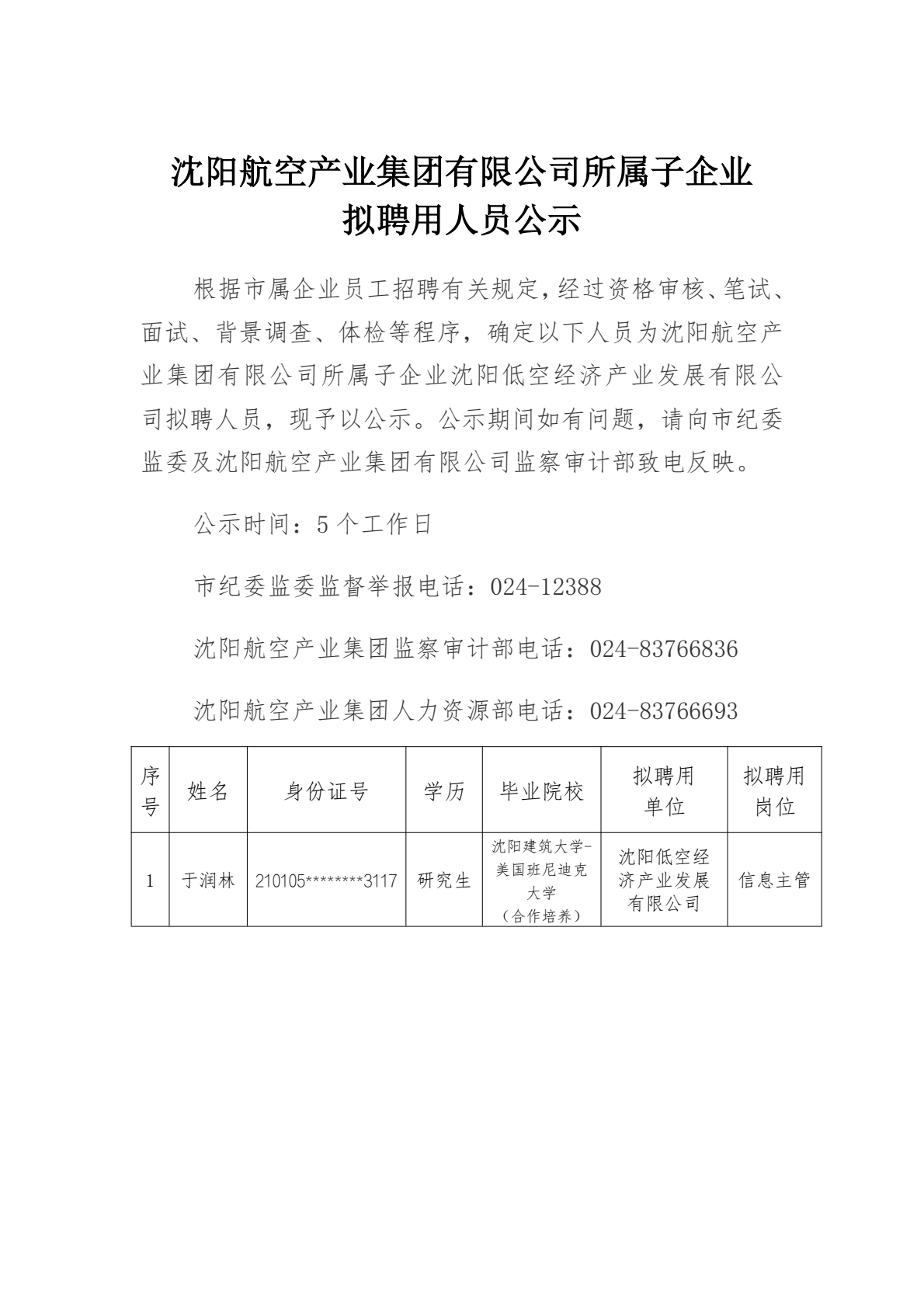 沈阳航空产业集团有限公司所属子企业拟聘用人员公示