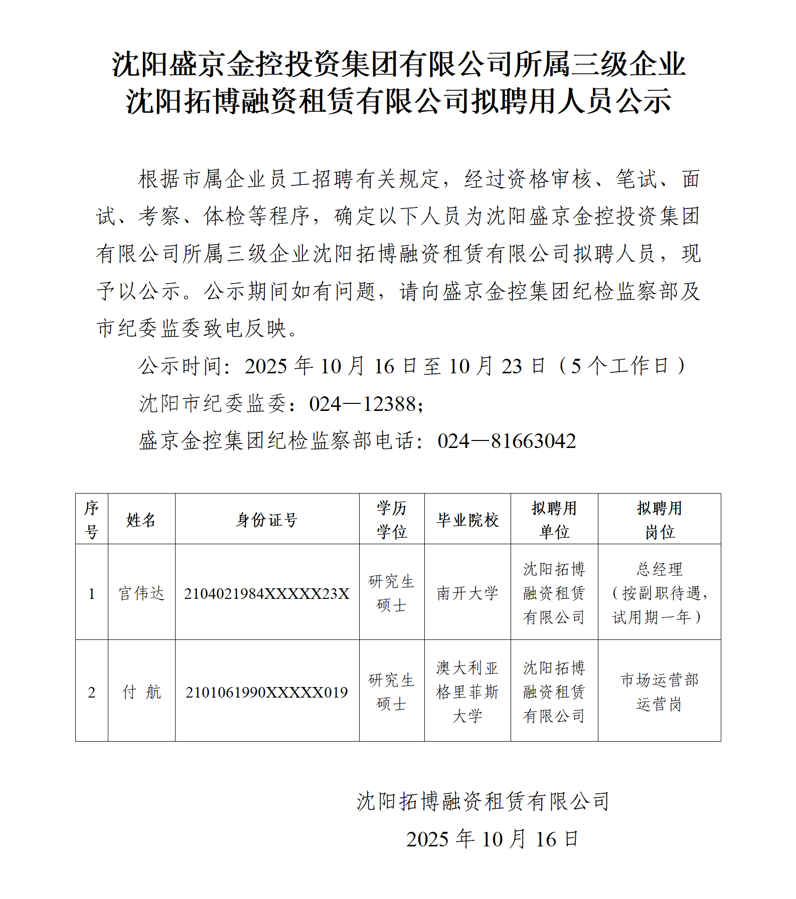 沈阳盛京金控投资集团有限公司所属三级企业沈阳拓博融资租赁有限公司拟聘用人员公示