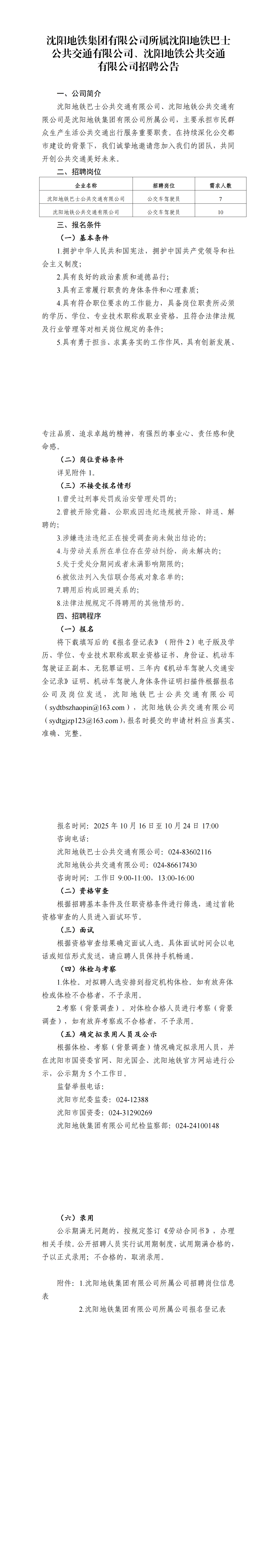 沈阳地铁集团有限公司所属沈阳地铁巴士公共交通有限公司、沈阳地铁公共交通有限公司招聘公告 文章来源:沈阳市国资委 发布于:2025-10-16 附件1:沈阳地铁集团有限公司所属公司招聘岗位信息表 (巴士、公交).pdf附表2:沈阳地铁集团有限公司所属公司报名登记表(巴士、公交).xls