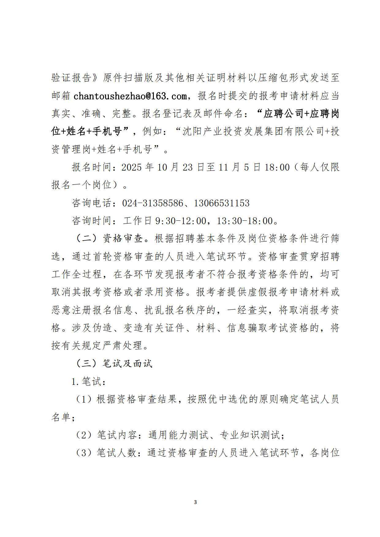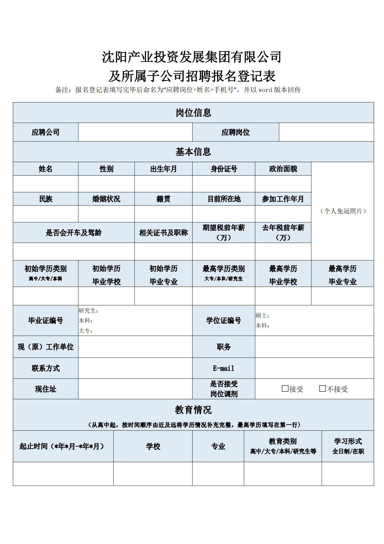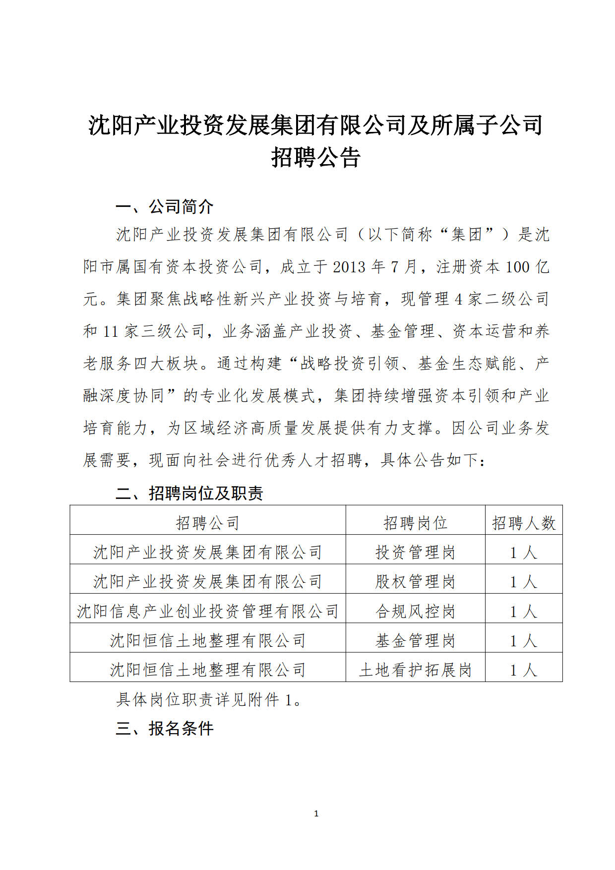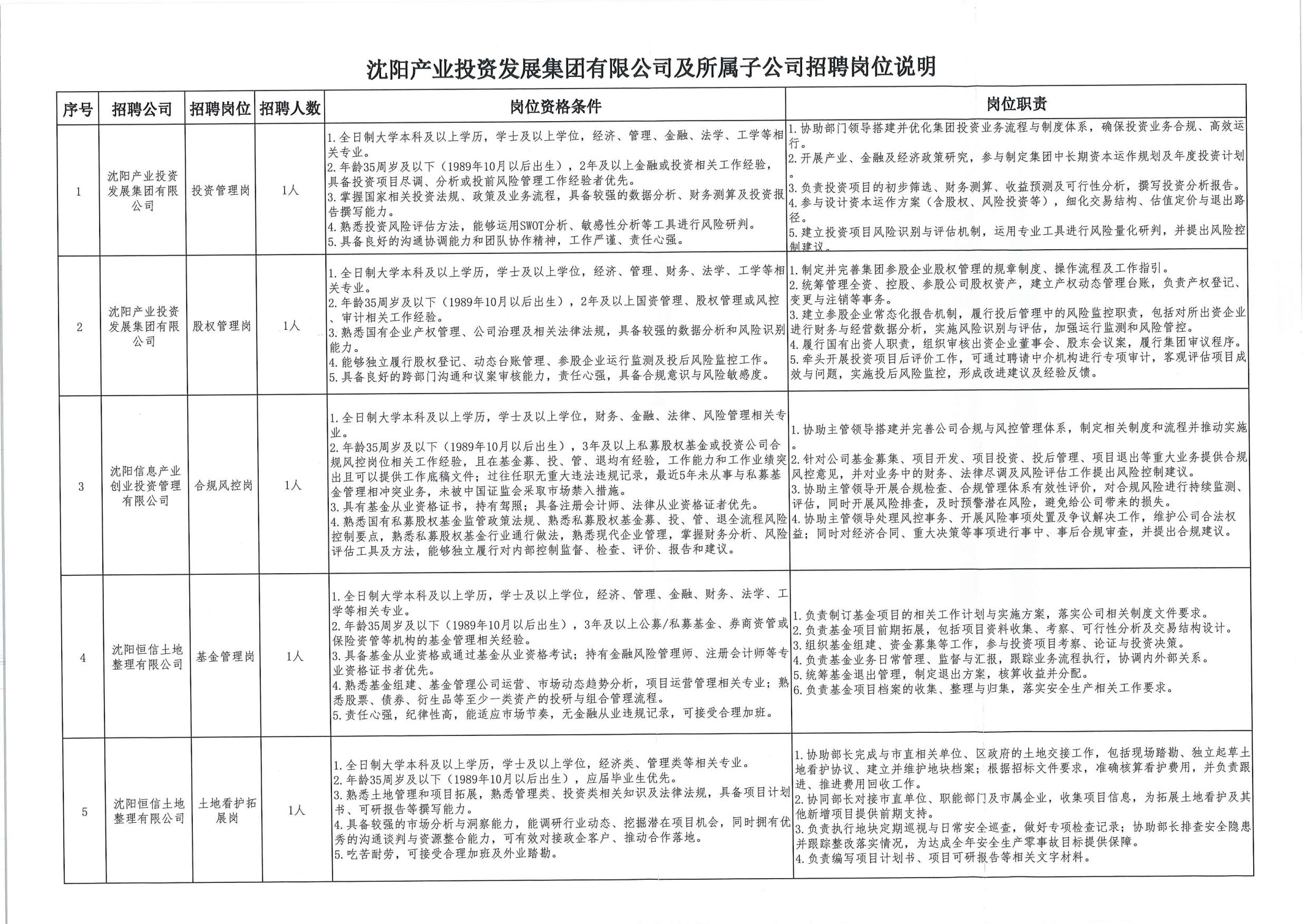 沈阳产业投资发展集团有限公司及所属子公司招聘公告 文章来源:沈阳市国资委 发布于:2025-10-23 附件1:沈阳产业投资发展集团有限公司及所属子公司招聘岗位说明.xlsx附件2:报名登记表.docx