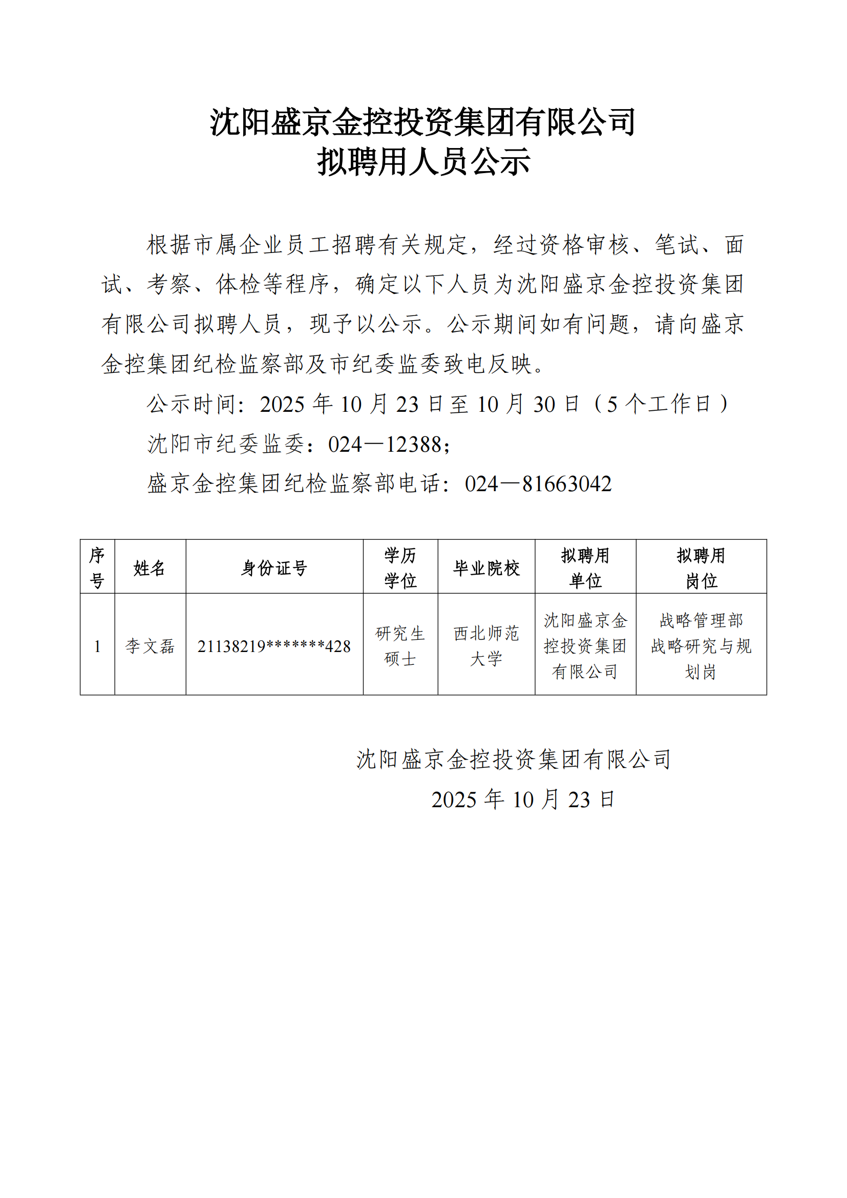沈阳盛京金控投资集团有限公司拟聘用人员公示