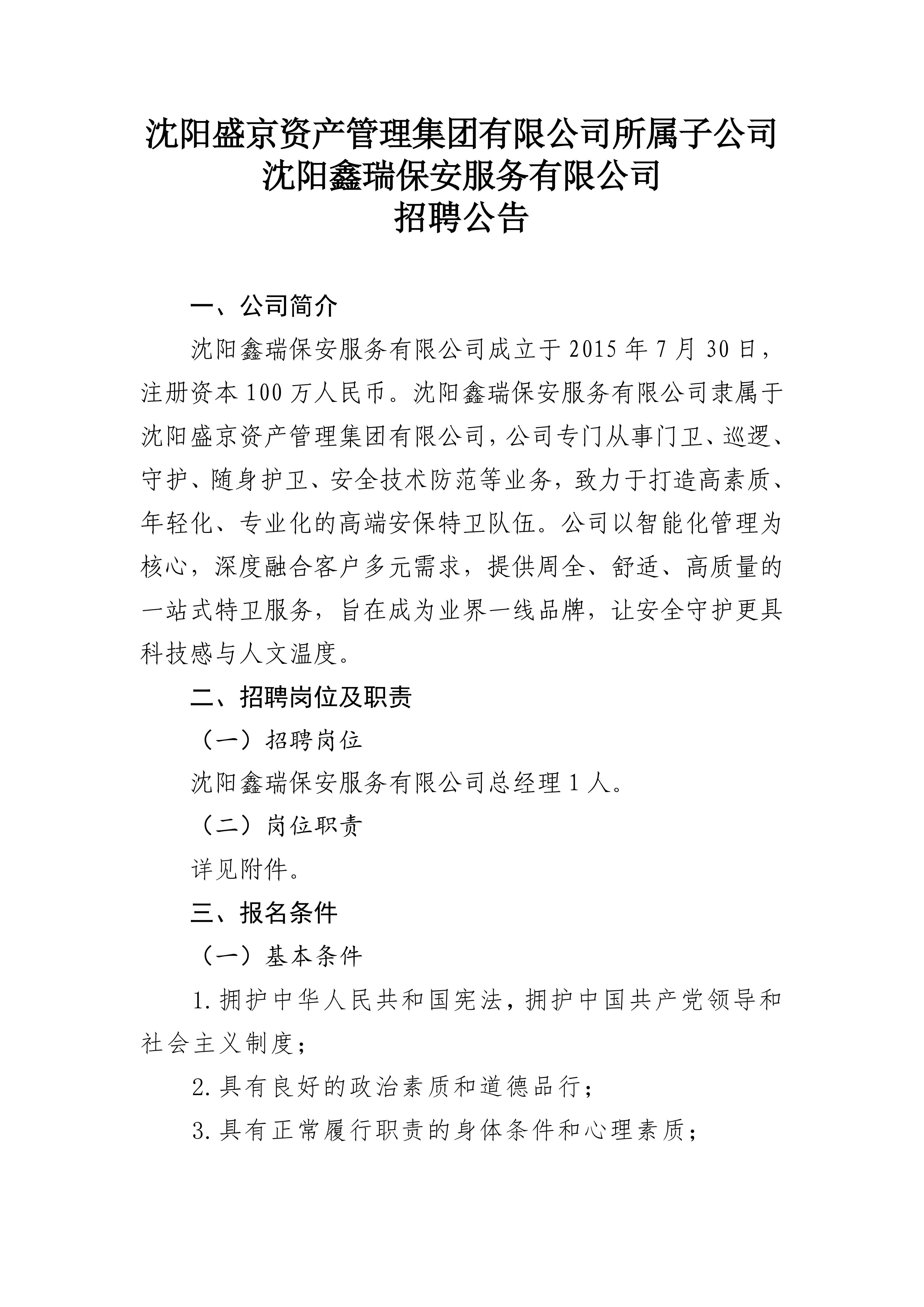 沈阳盛京资产管理集团有限公司所属子公司沈阳鑫瑞保安服务有限公司招聘公告