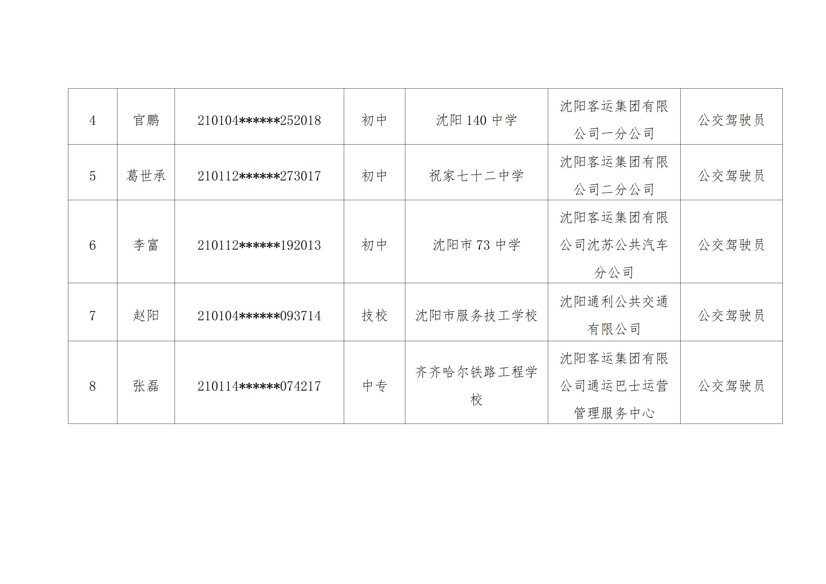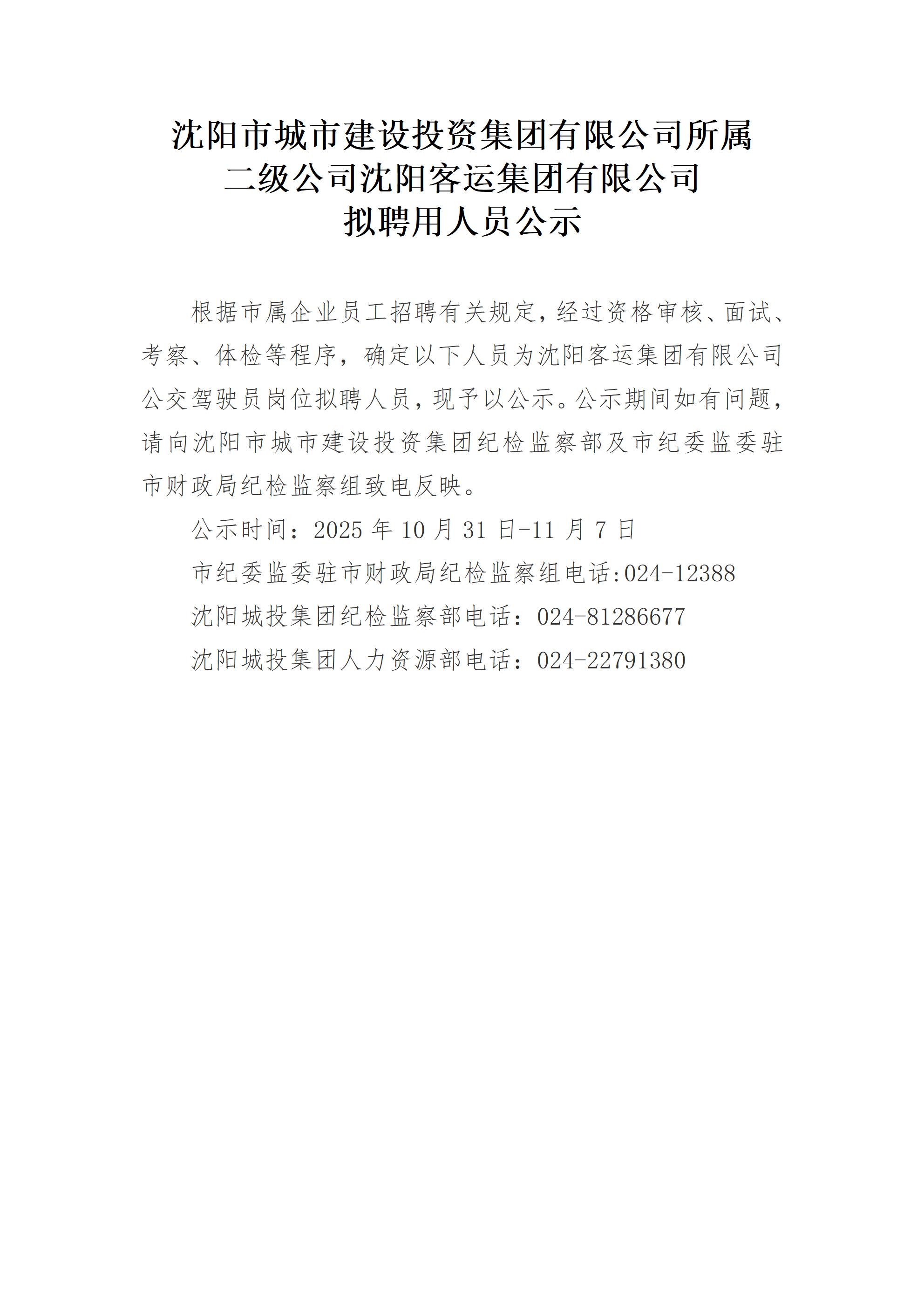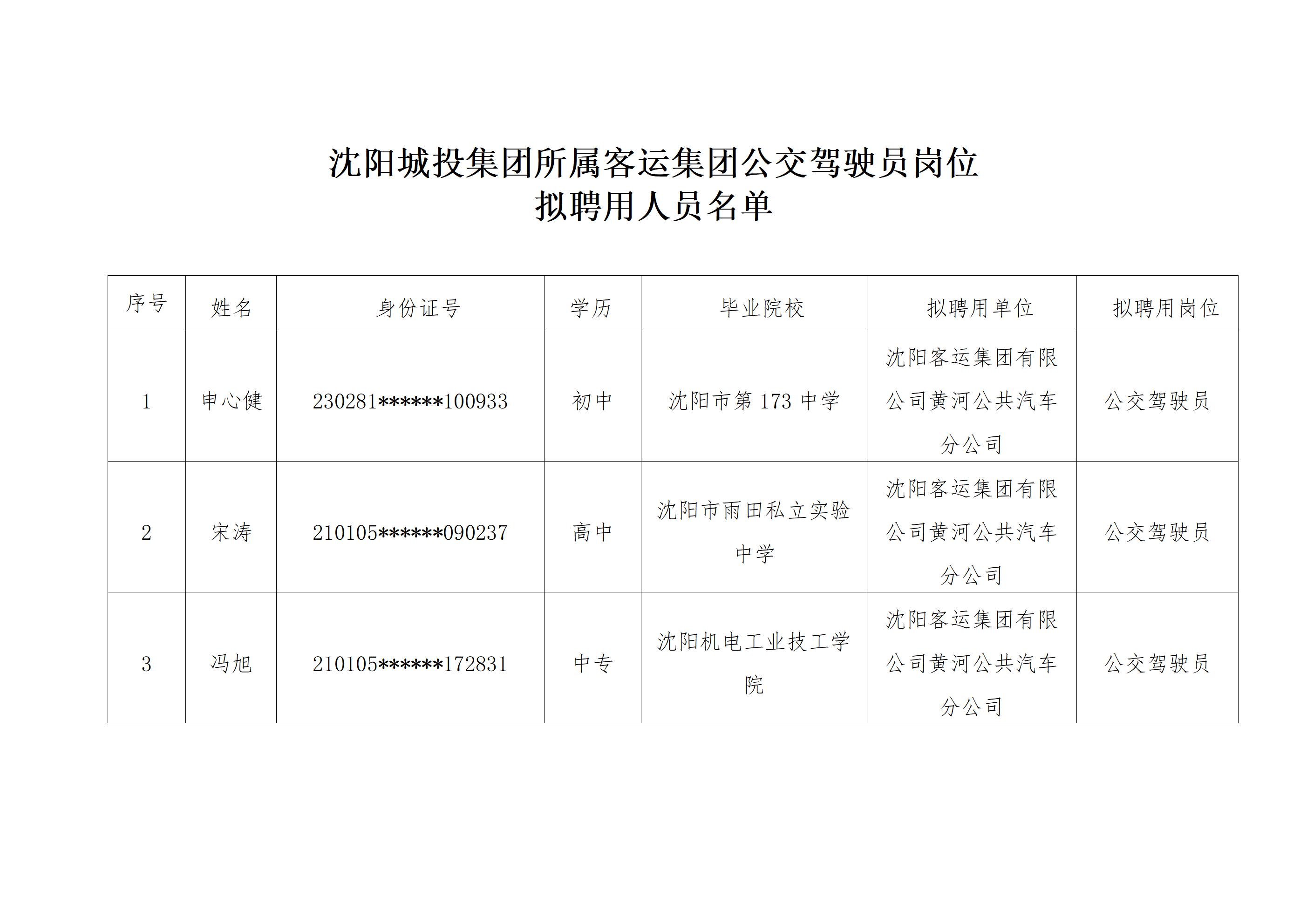 沈阳市城市建设投资集团有限公司所属二级公司沈阳客运集团有限公司拟聘用人员公示