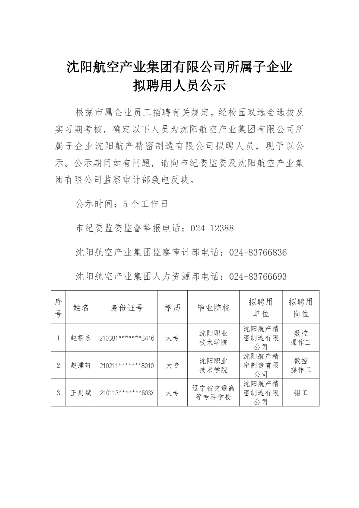 沈阳航空产业集团有限公司所属子企业拟聘用人员公示