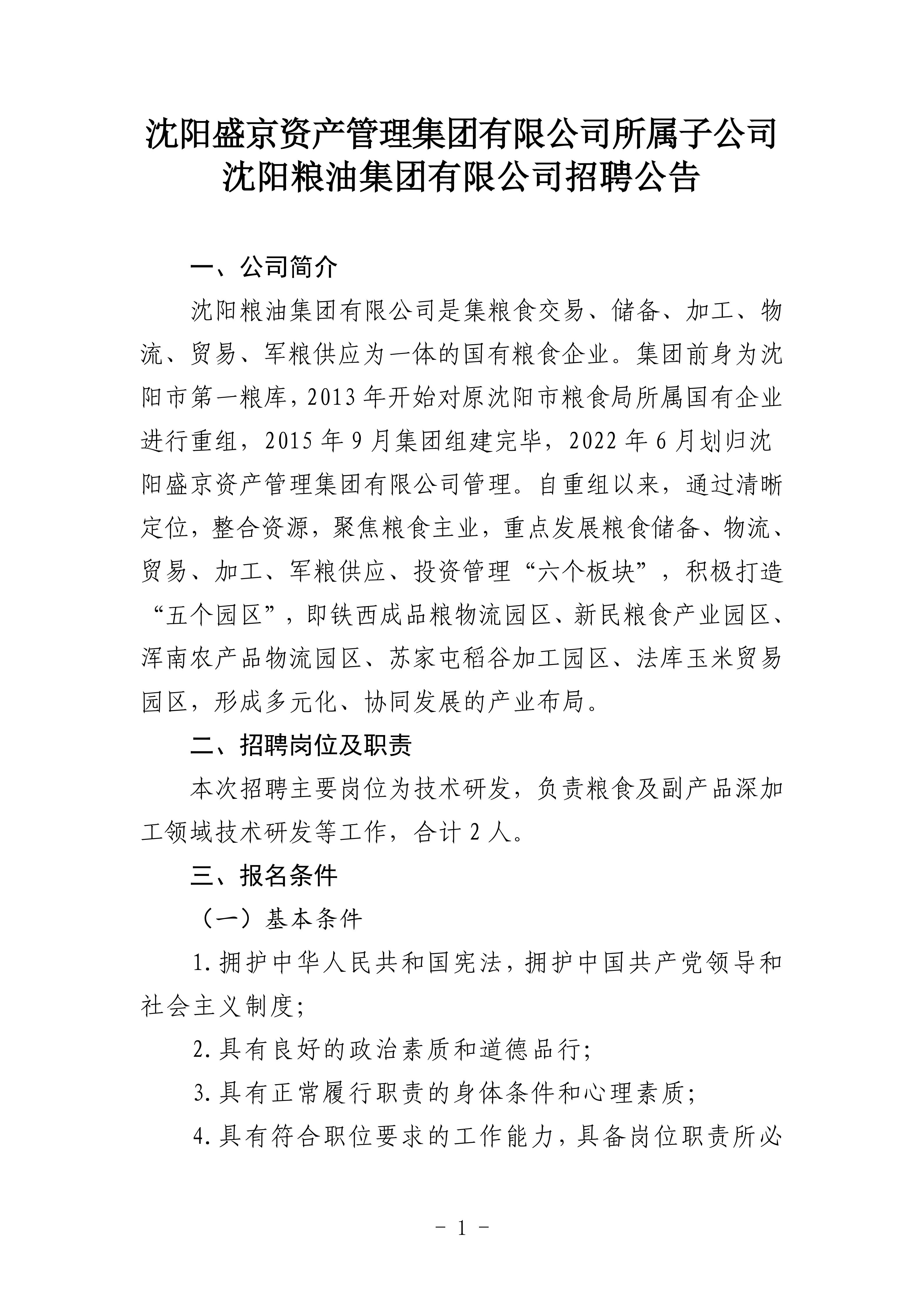 沈阳盛京资产管理集团有限公司所属子公司沈阳粮油集团有限公司招聘公告