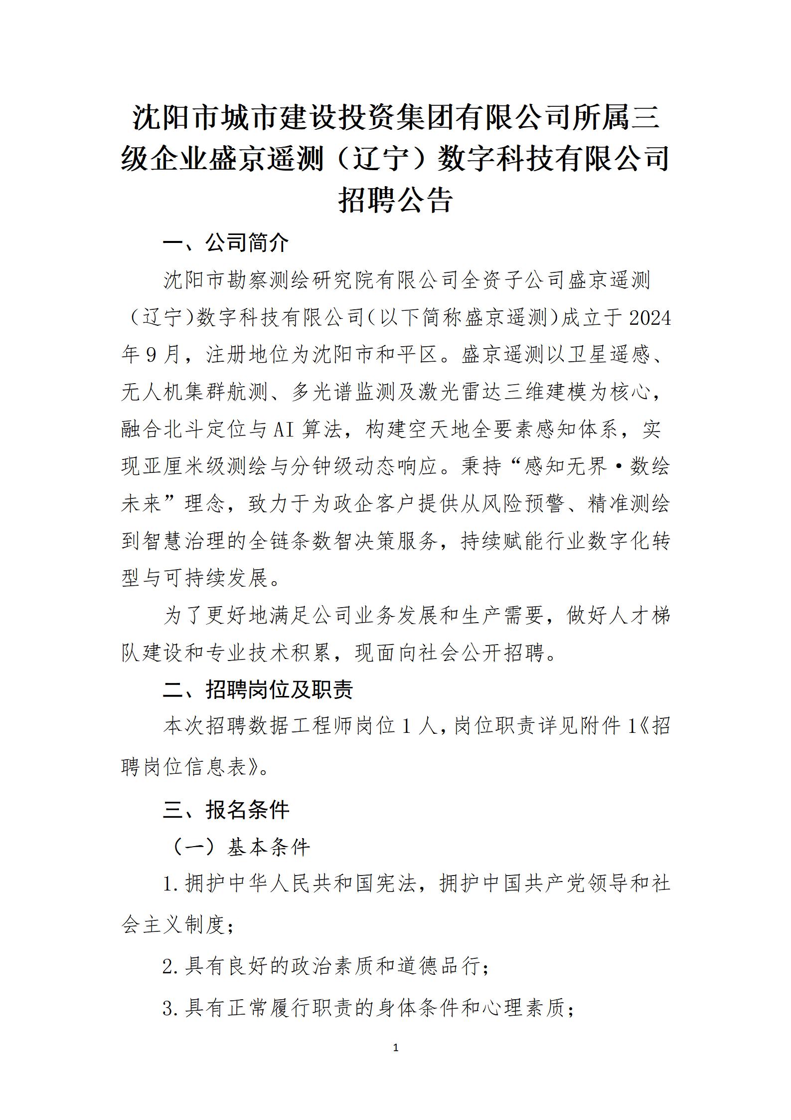 沈阳市城市建设投资集团有限公司所属三级企业盛京遥测(辽宁)数字科技有限公司招聘公告