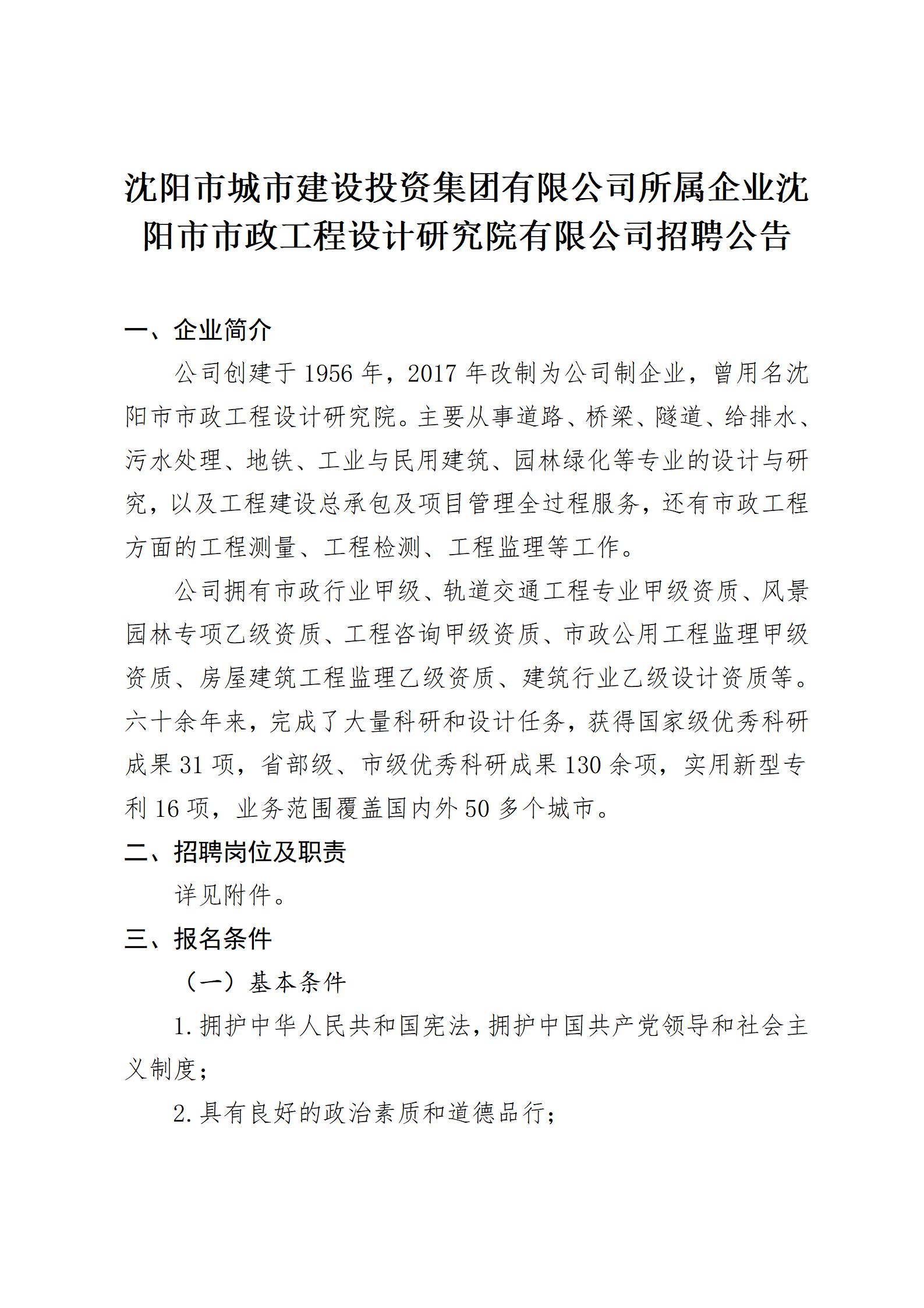 沈阳市城市建设投资集团有限公司所属企业沈阳市市政工程设计研究院有限公司招聘公告