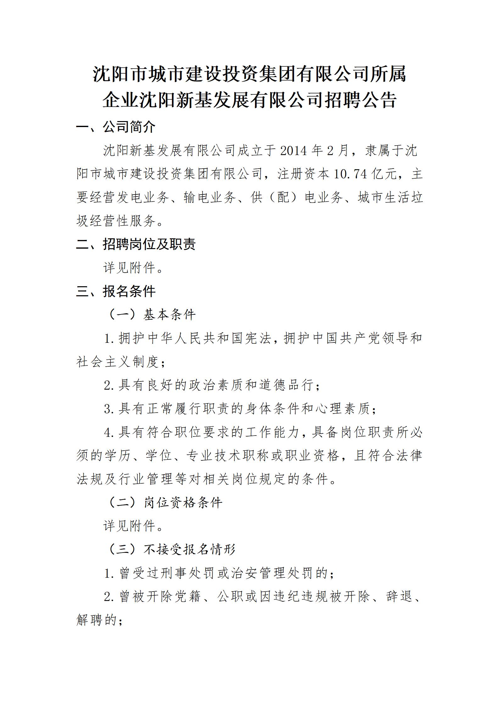 沈阳市城市建设投资集团有限公司所属企业沈阳新基发展有限公司招聘公告