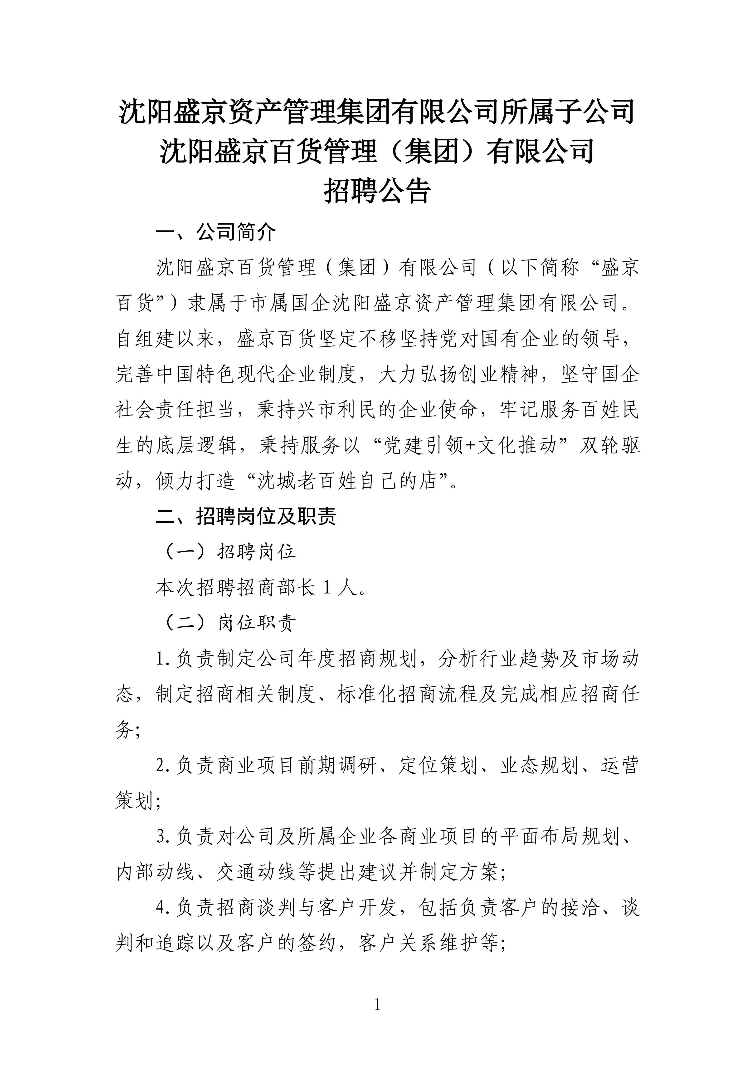沈阳盛京资产管理集团有限公司所属子公司沈阳盛京百货管理(集团)有限公司招聘公告