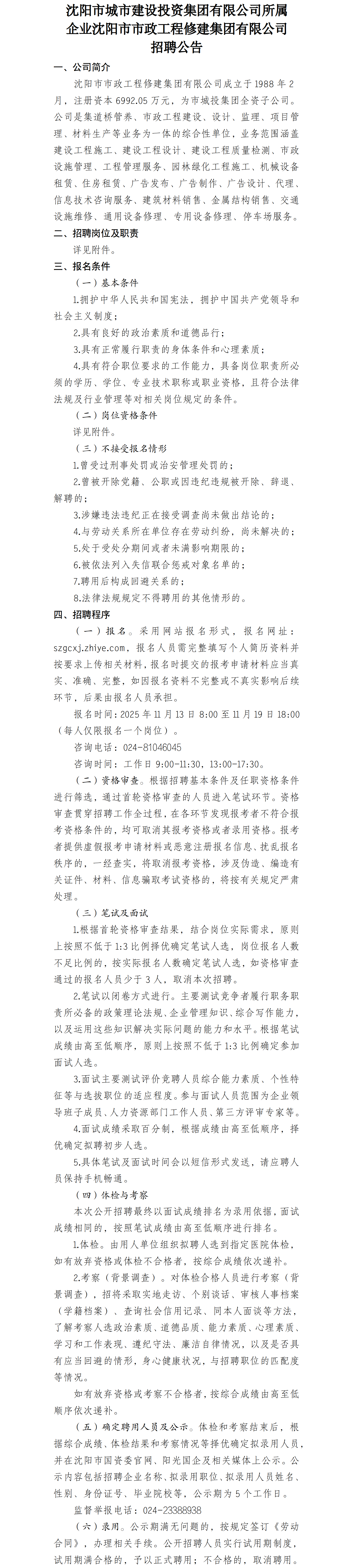 沈阳市城市建设投资集团有限公司所属企业沈阳市市政工程修建集团有限公司招聘公告