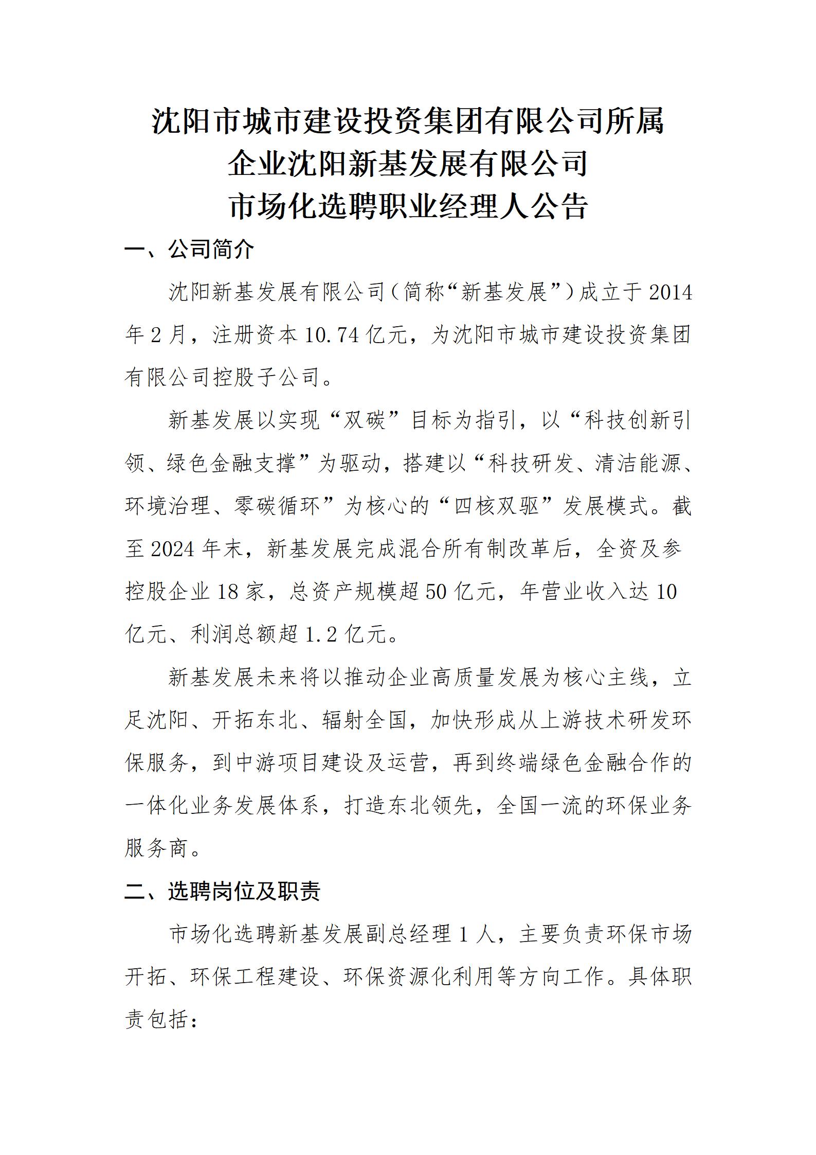 沈阳市城市建设投资集团有限公司所属企业沈阳新基发展有限公司市场化选聘职业经理人公告
