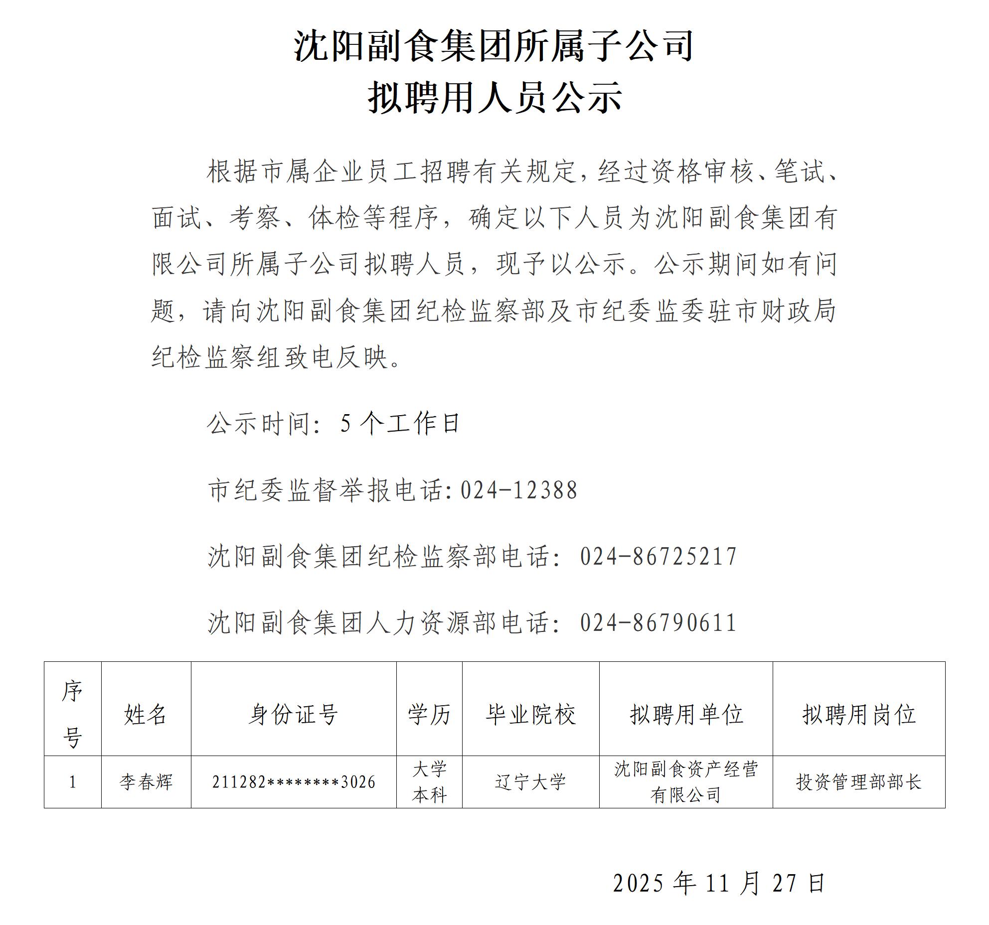 沈阳副食集团所属子公司拟聘用人员公示