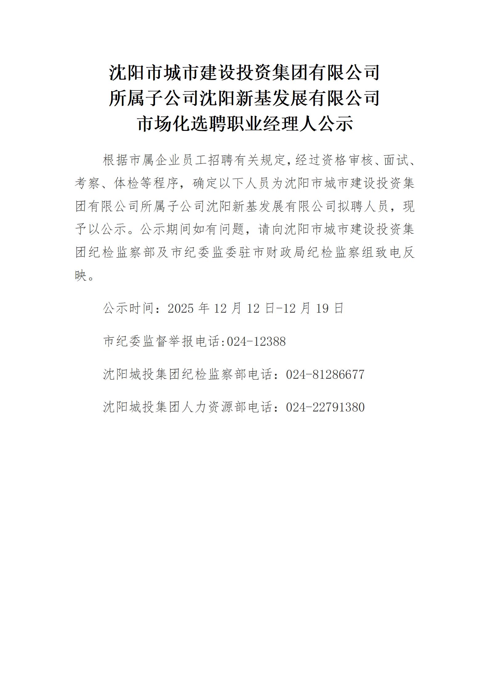 沈阳市城市建设投资集团有限公司所属子公司沈阳新基发展有限公司拟聘用人员公示