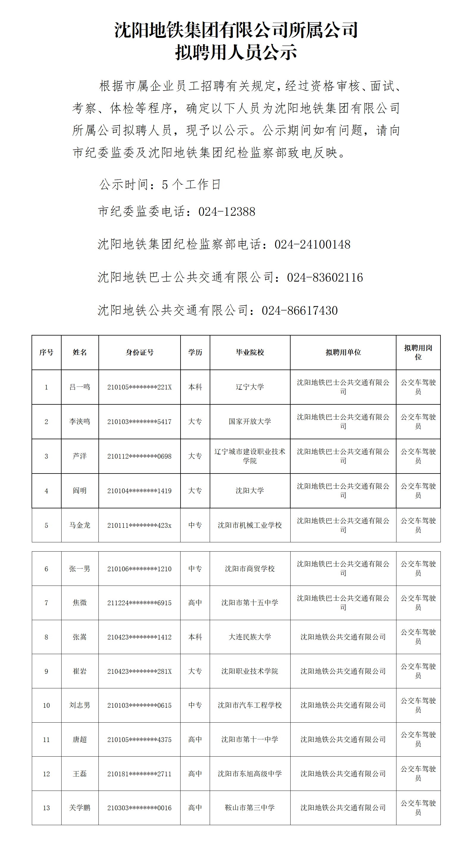 沈阳地铁集团有限公司所属公司拟聘用人员公示