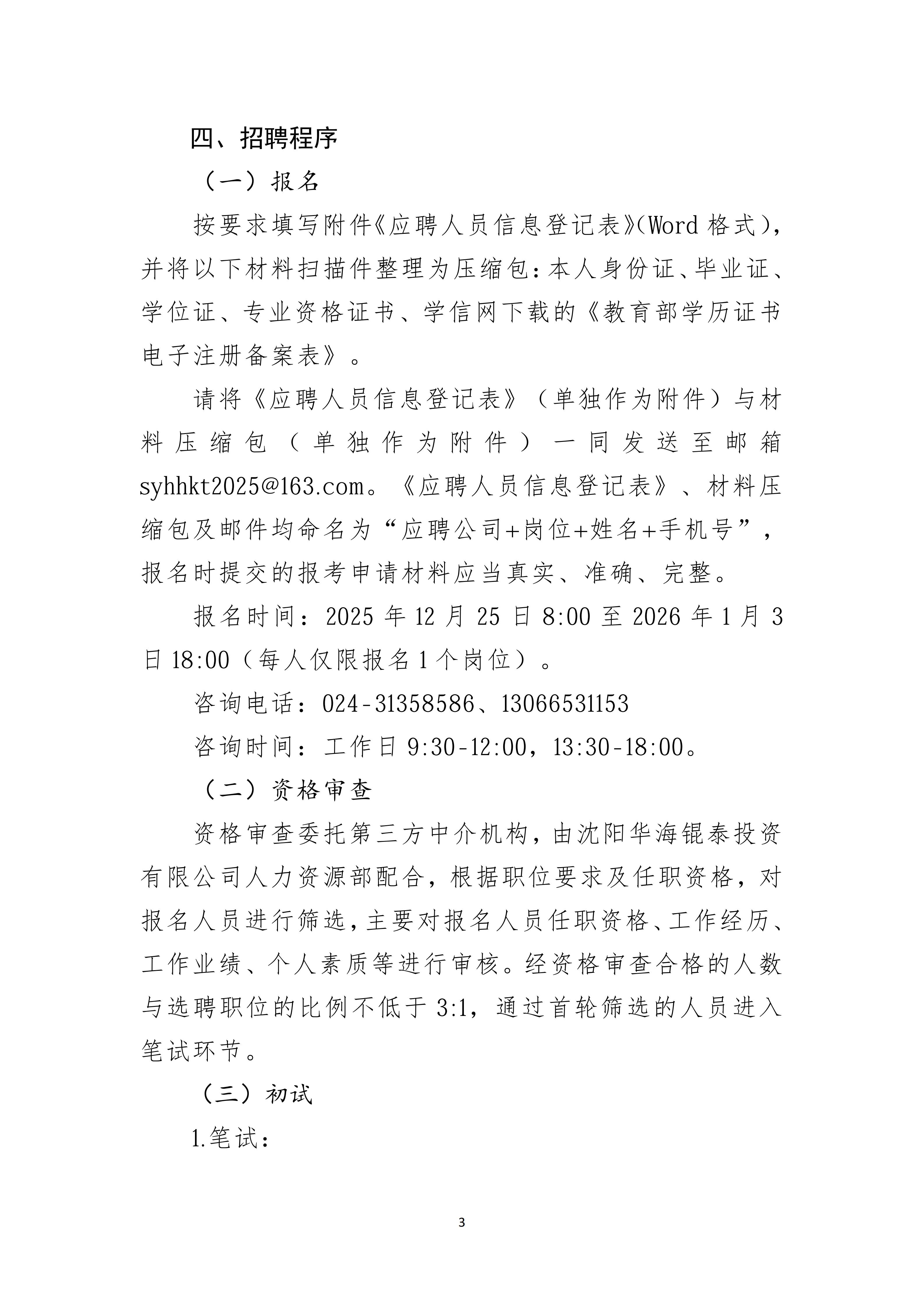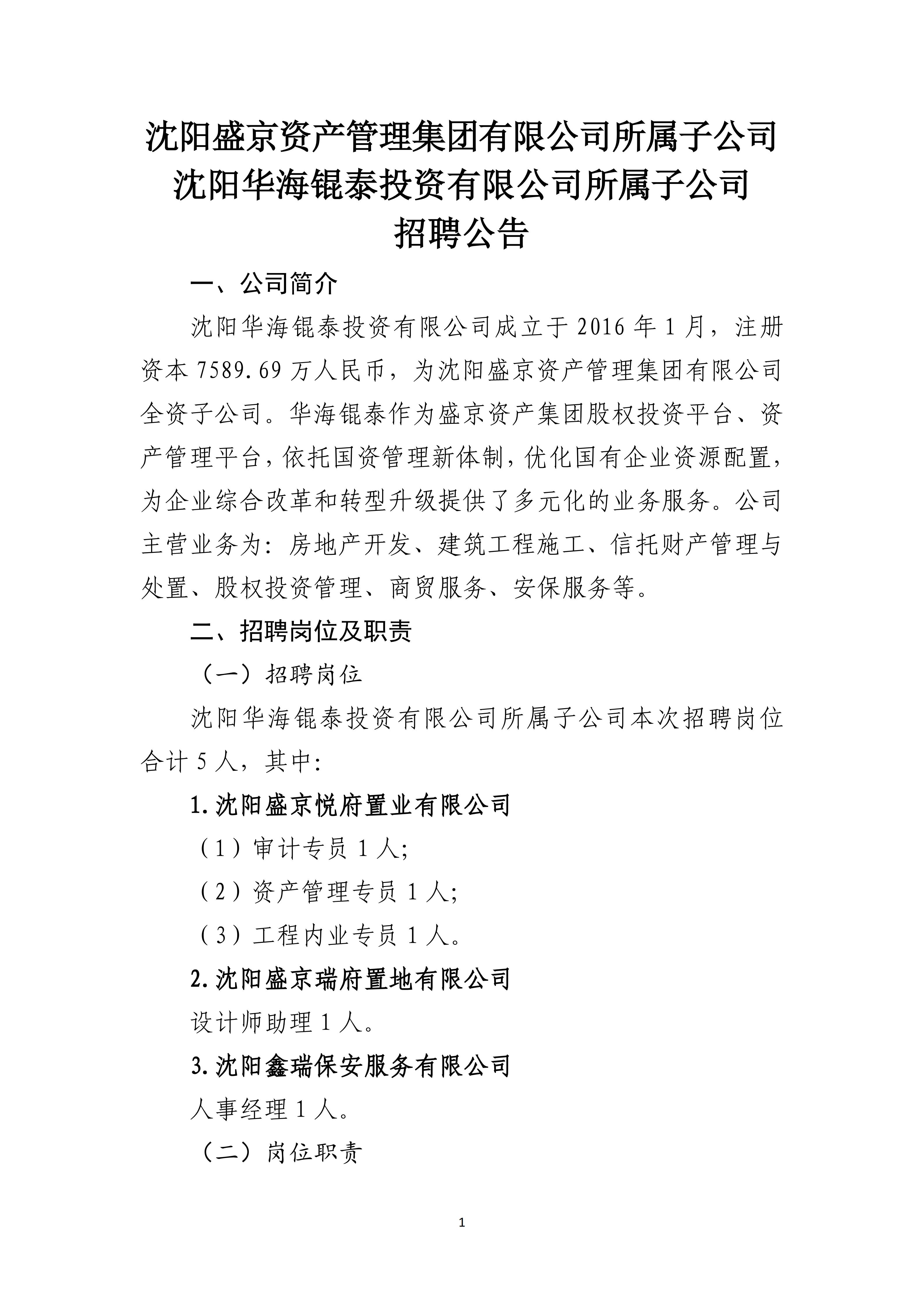 沈阳盛京资产管理集团有限公司所属子公司沈阳华海锟泰投资有限公司所属子公司招聘公告 文章来源:沈阳市国资委 发布于:2025-12-25 附件1:招聘岗位信息表.xlsx附件2:应聘人员信息登记表.docx