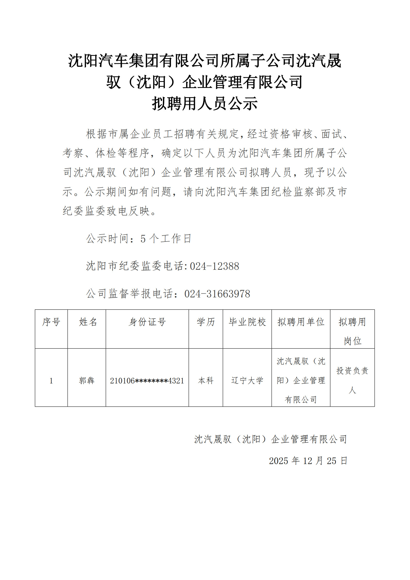沈阳汽车集团有限公司所属子公司沈汽晟驭(沈阳)企业管理有限公司拟聘用人员公示
