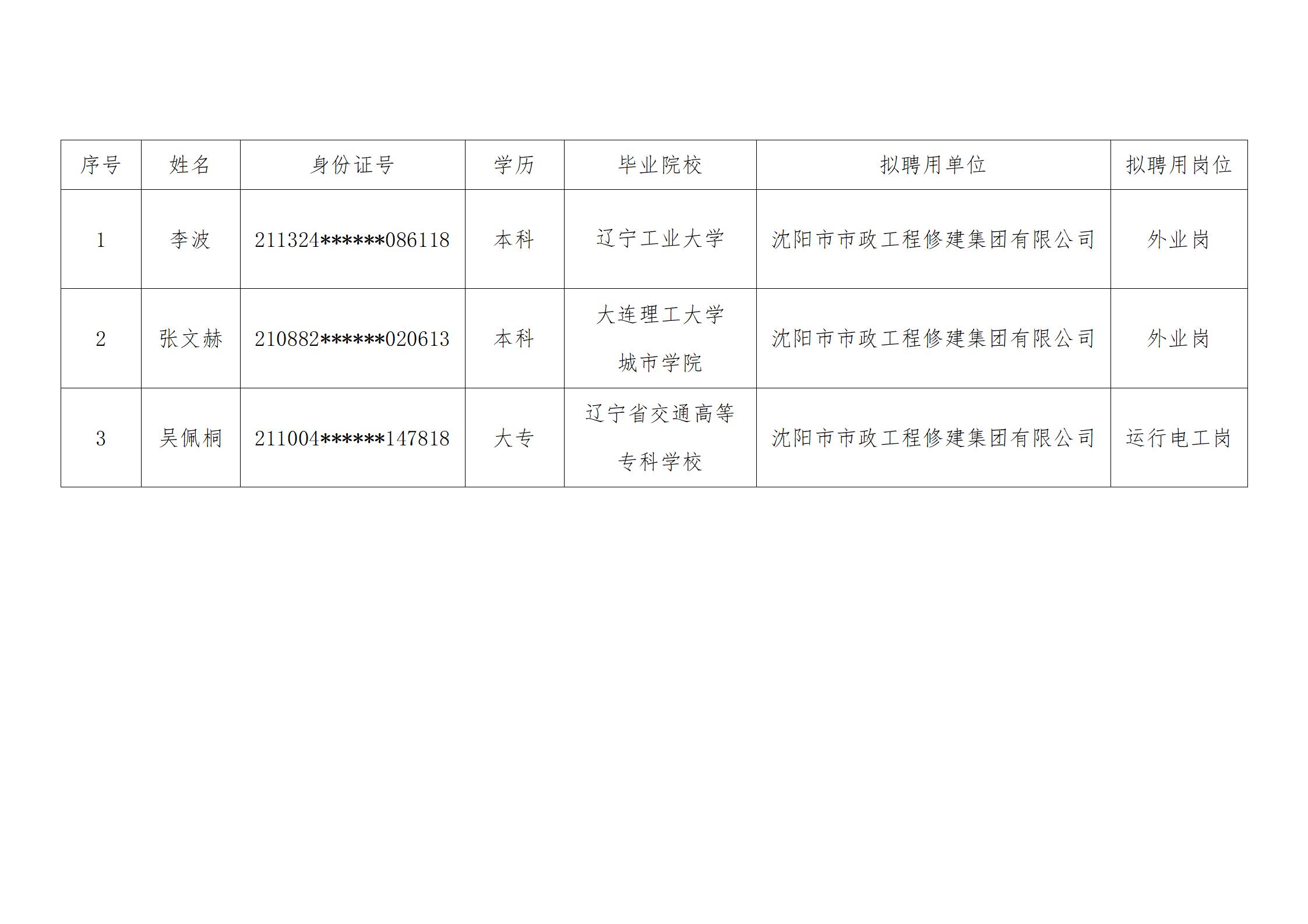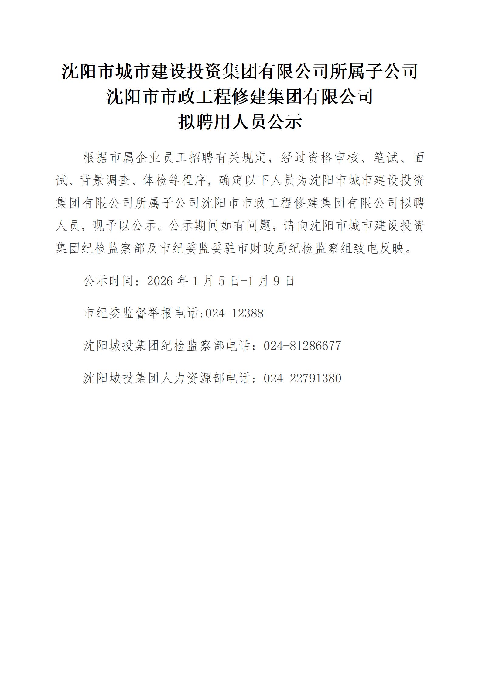 沈阳市城市建设投资集团有限公司所属子公司沈阳市市政工程修建集团有限公司拟聘用人员公示