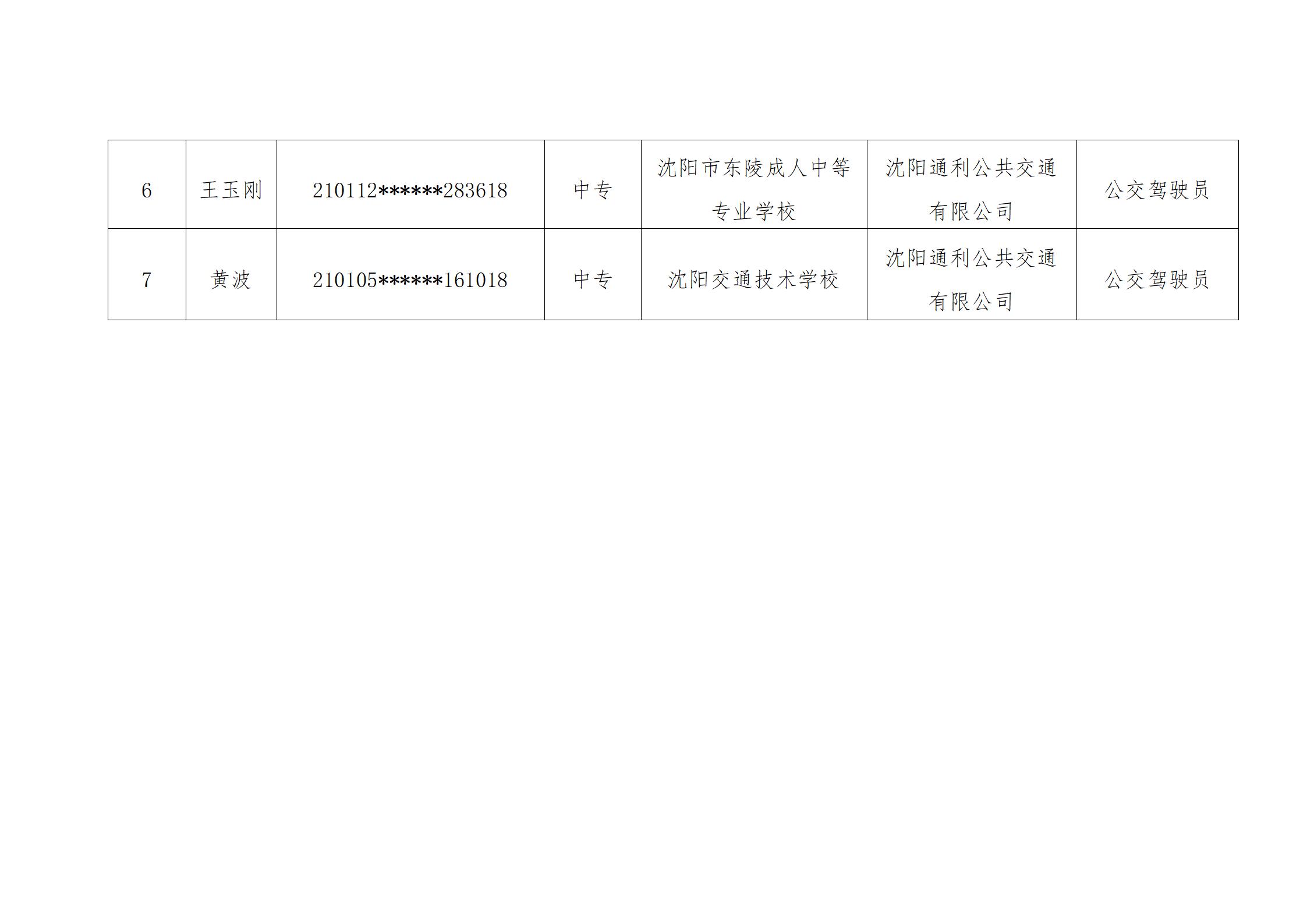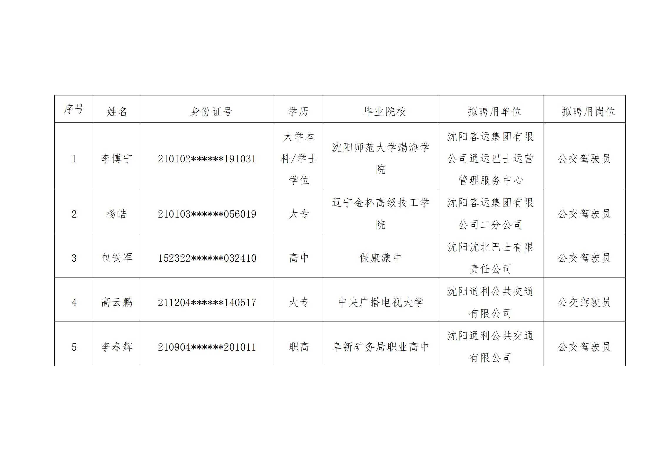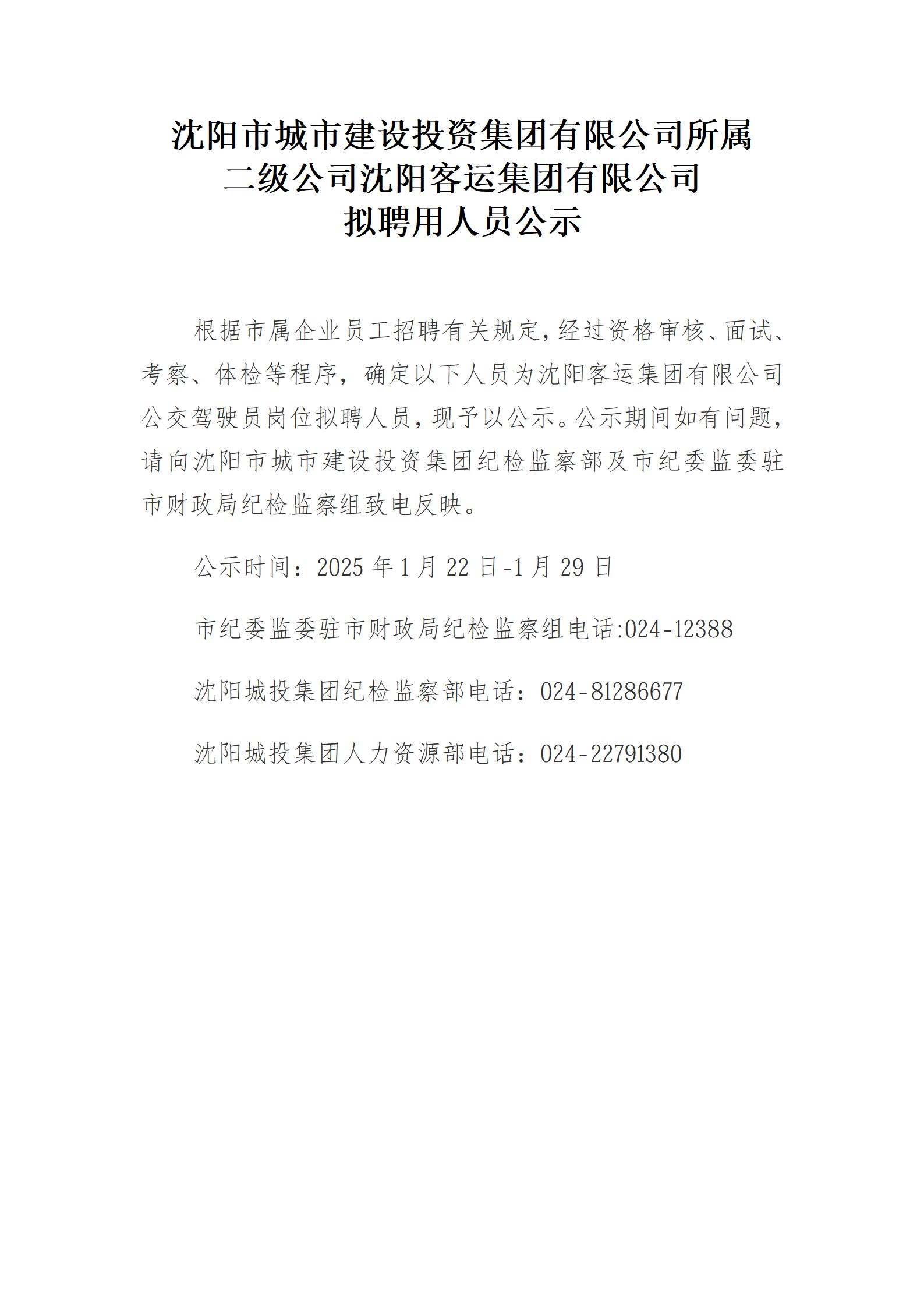 沈阳市城市建设投资集团有限公司所属二级公司沈阳客运集团有限公司拟聘用人员公示