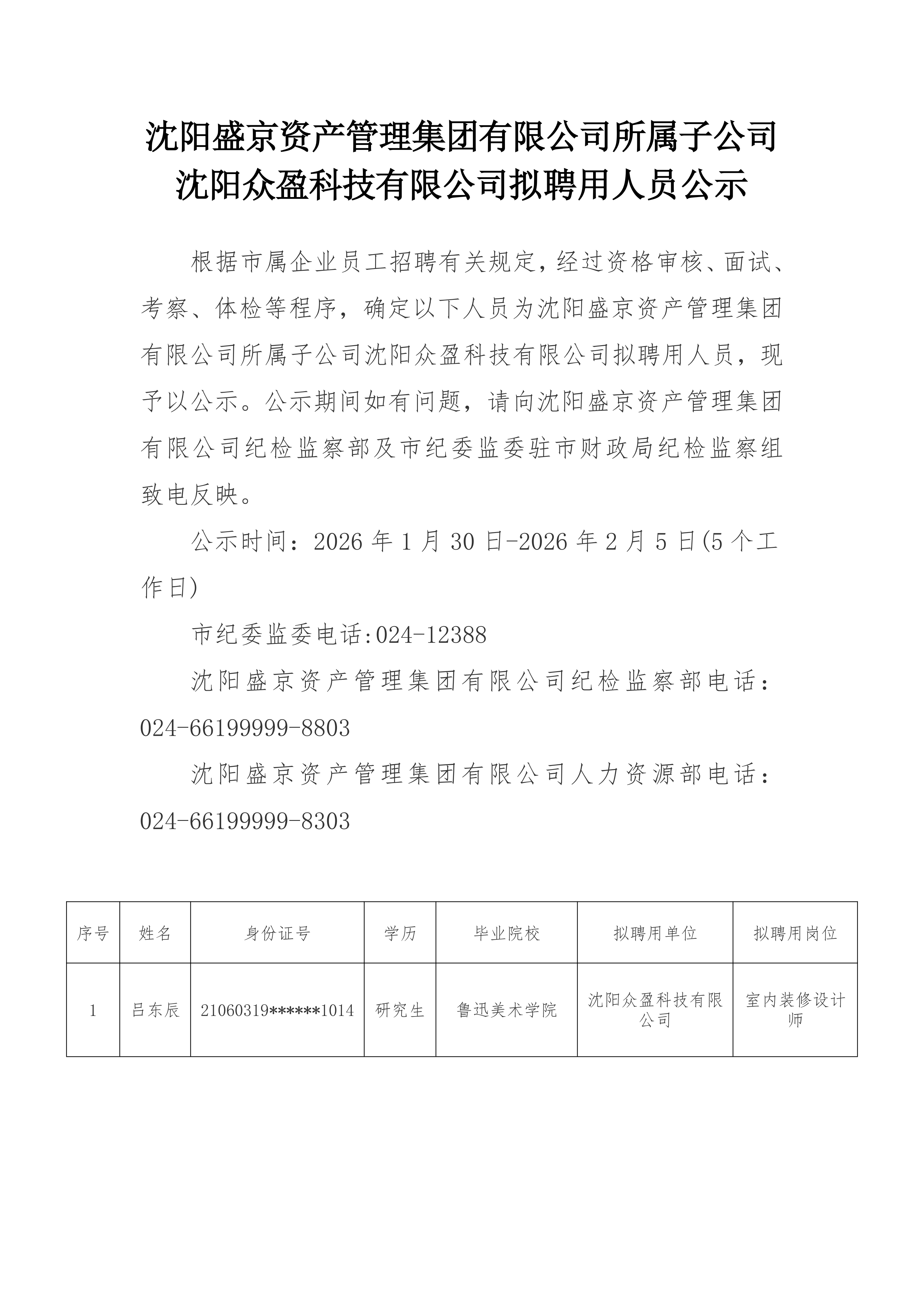 沈阳盛京资产管理集团有限公司所属子公司沈阳众盈科技有限公司拟聘用人员公示