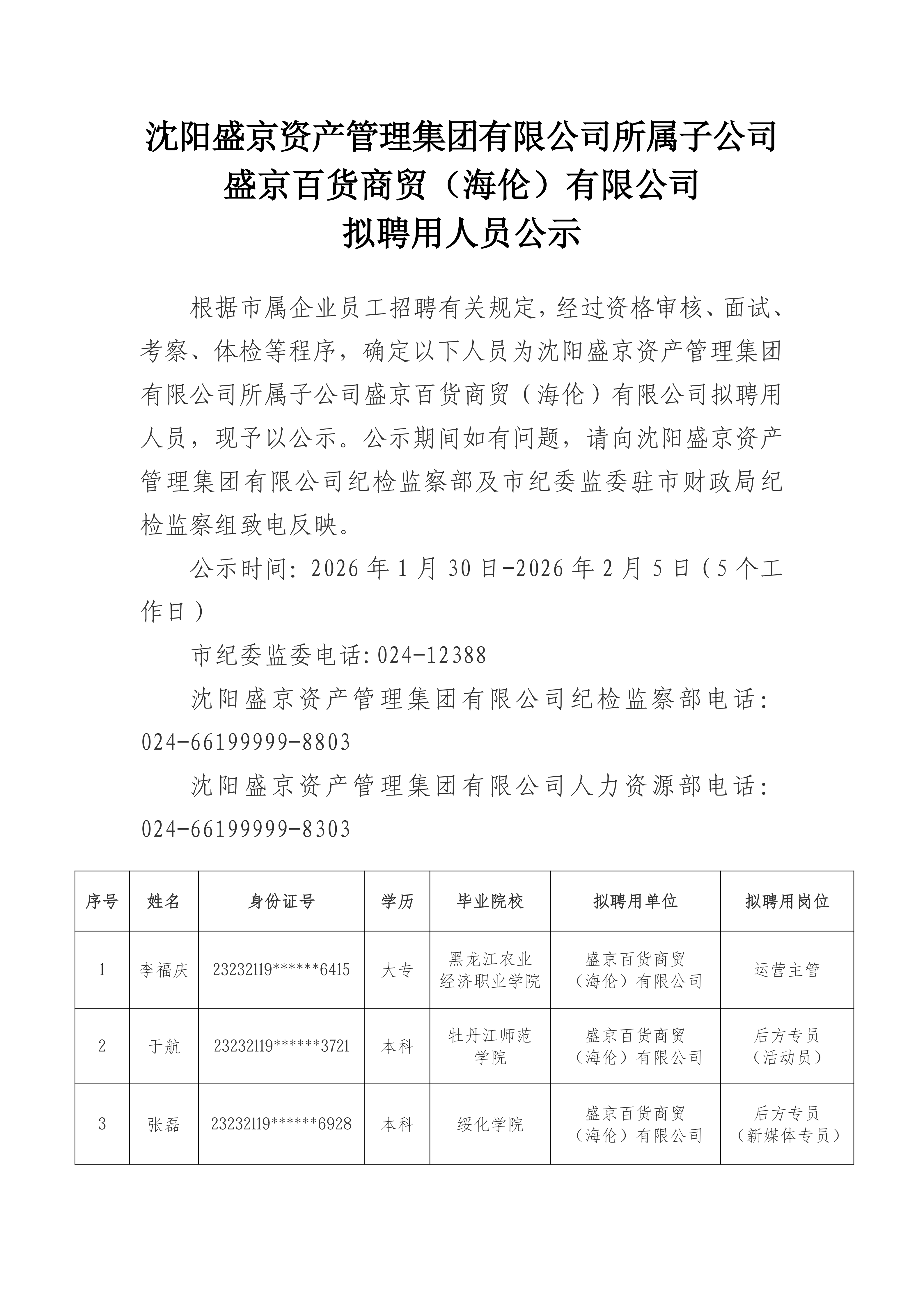 沈阳盛京资产管理集团有限公司所属子公司盛京百货商贸(海伦)有限公司拟聘人员公示