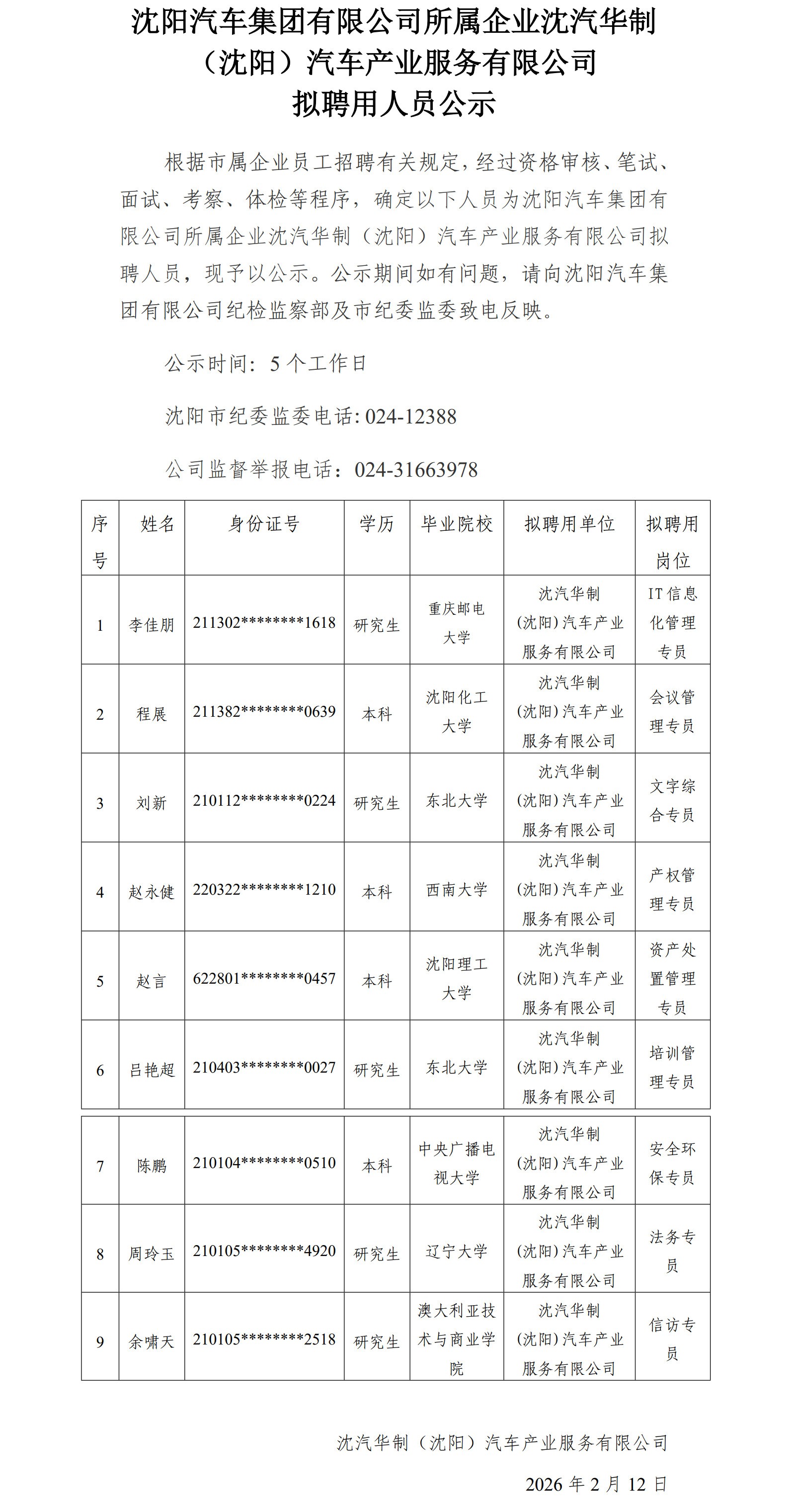 沈阳汽车集团有限公司所属企业沈汽华制(沈阳)汽车产业服务有限公司拟聘用人员公示
