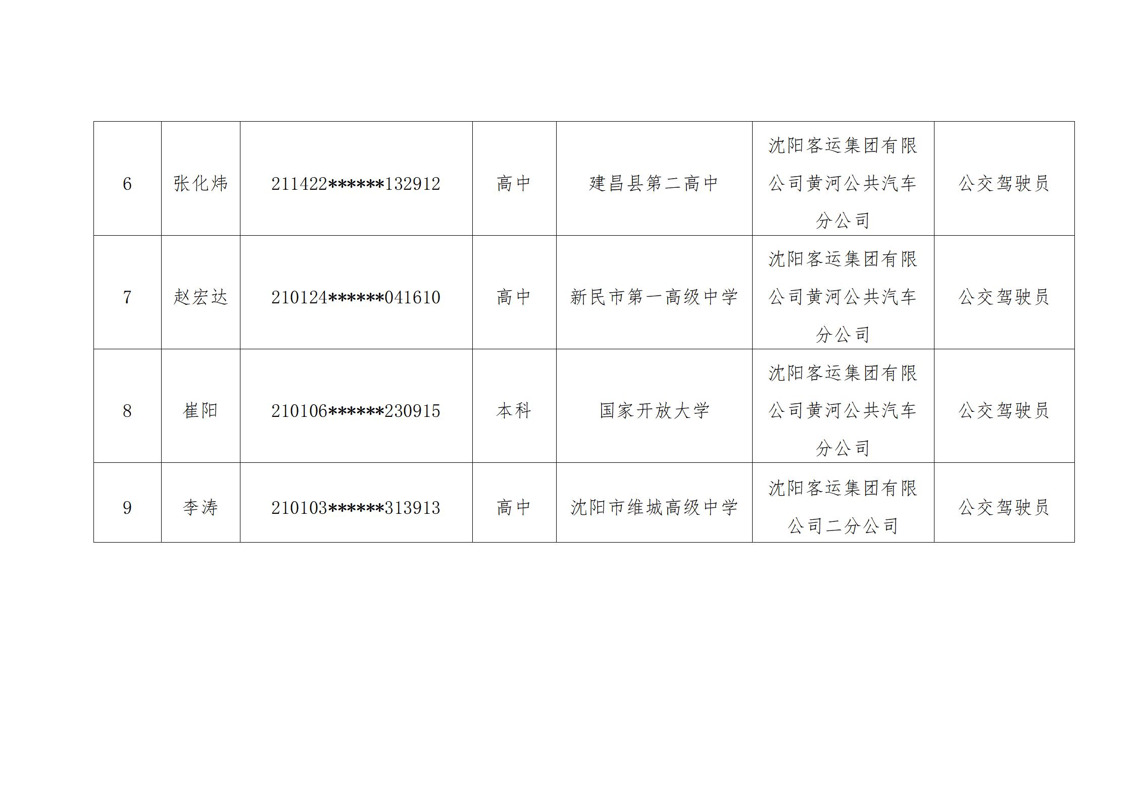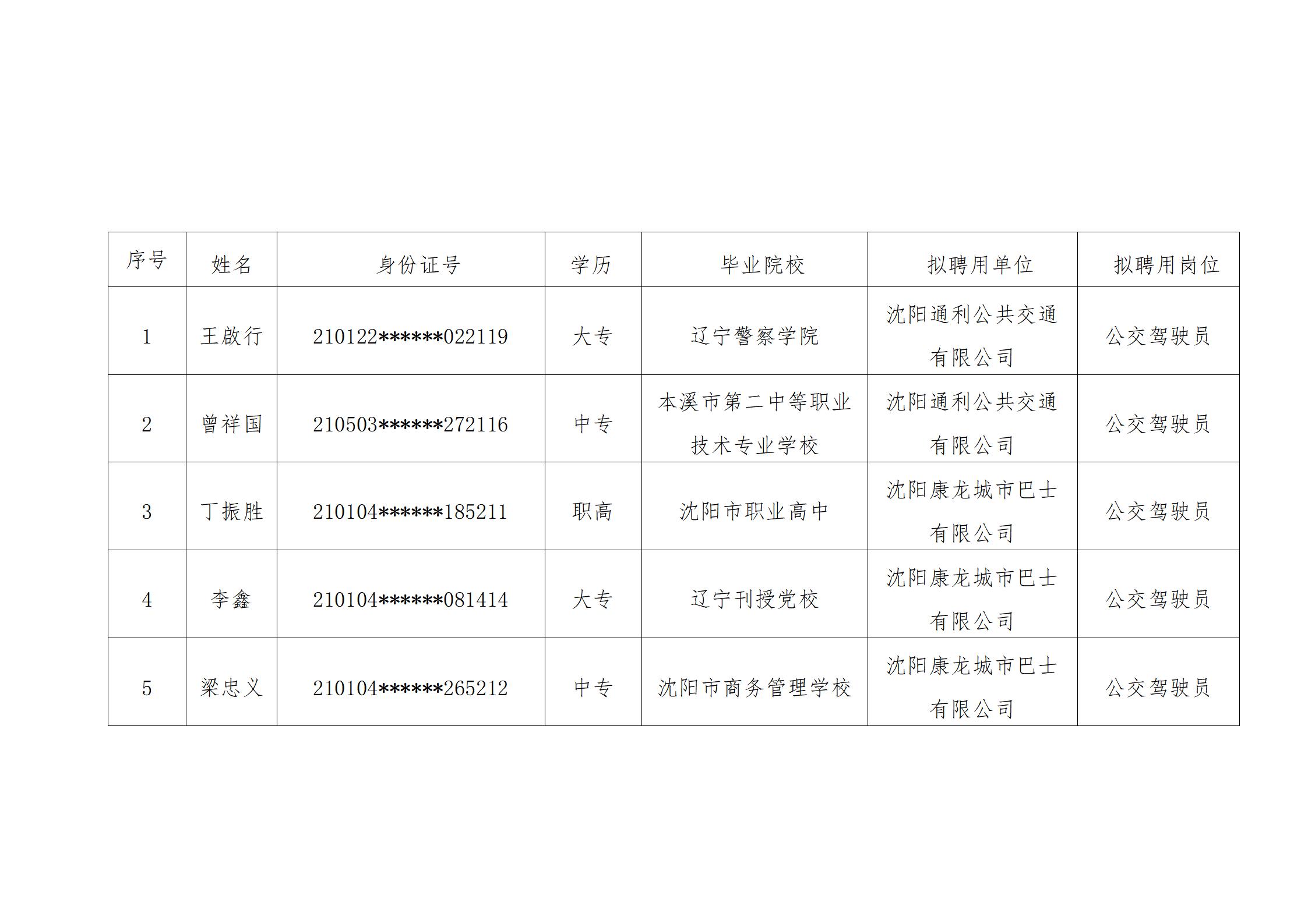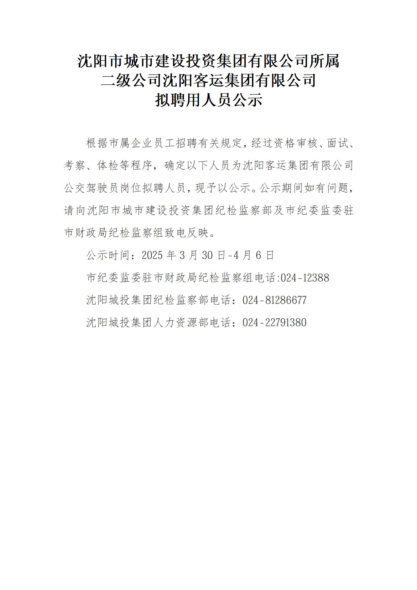 沈阳市城市建设投资集团有限公司所属 二级公司沈阳客运集团有限公司拟聘用人员公示