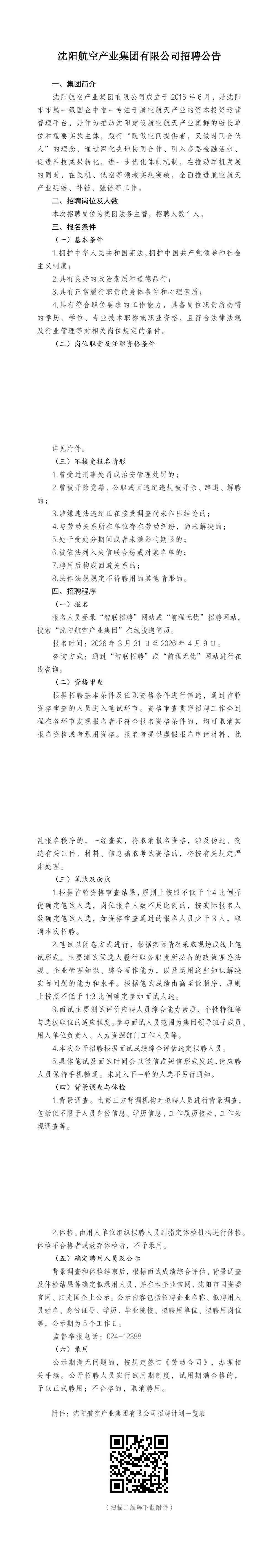 沈阳航空产业集团有限公司招聘公告