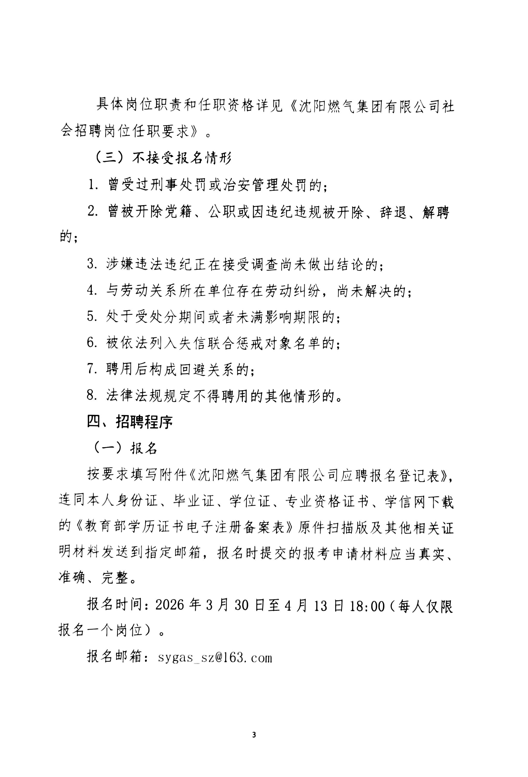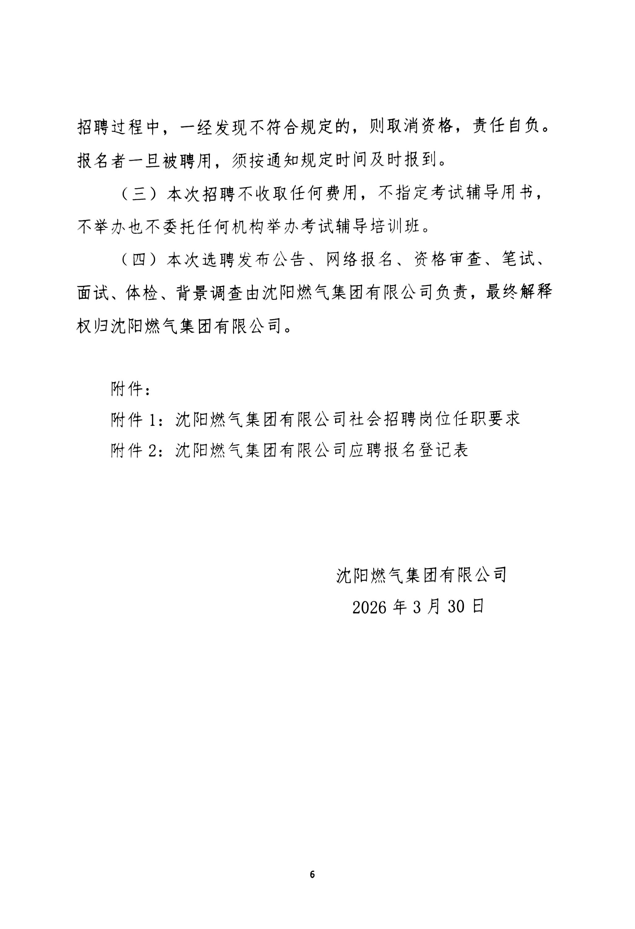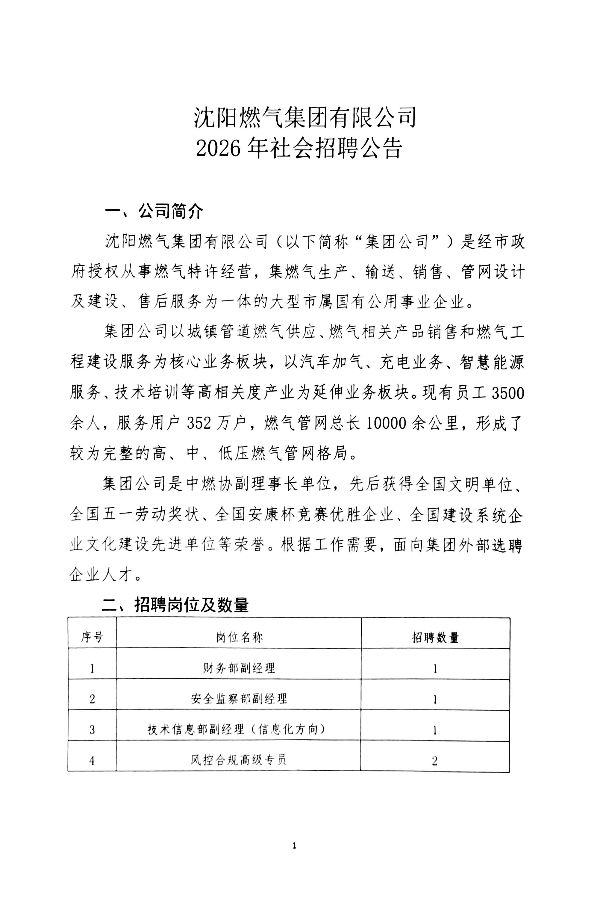 沈阳燃气集团有限公司2026年社会招聘公告 文章来源:沈阳市国资委 发布于:2026-03-30 附件1沈阳燃气集团有限公司社会招聘岗位任职要求.xlsx附件2沈阳燃气集团有限公司应聘报名登记表.docx