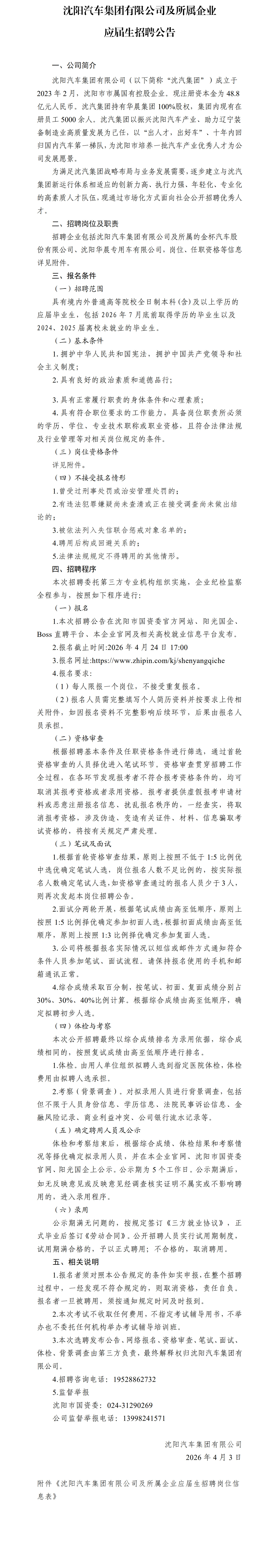 沈阳汽车集团有限公司及所属企业应届生招聘公告