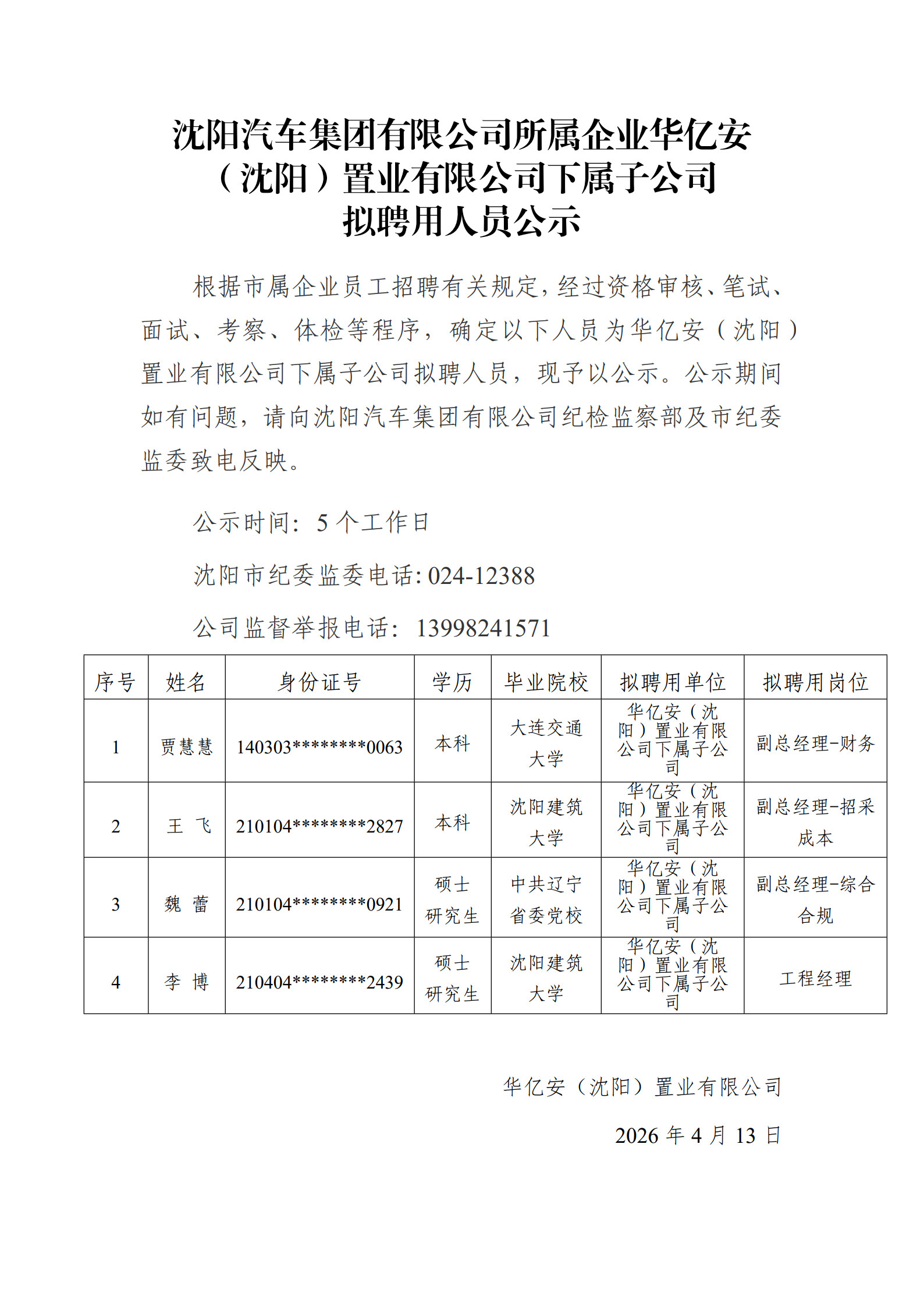 沈阳汽车集团有限公司所属企业华亿安(沈阳)置业有限公司下属子公司拟聘用人员公示