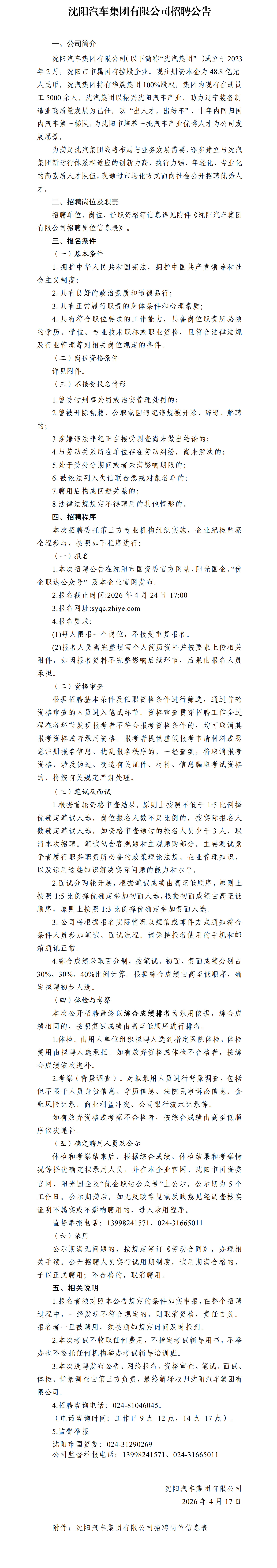 沈阳汽车集团有限公司招聘公告