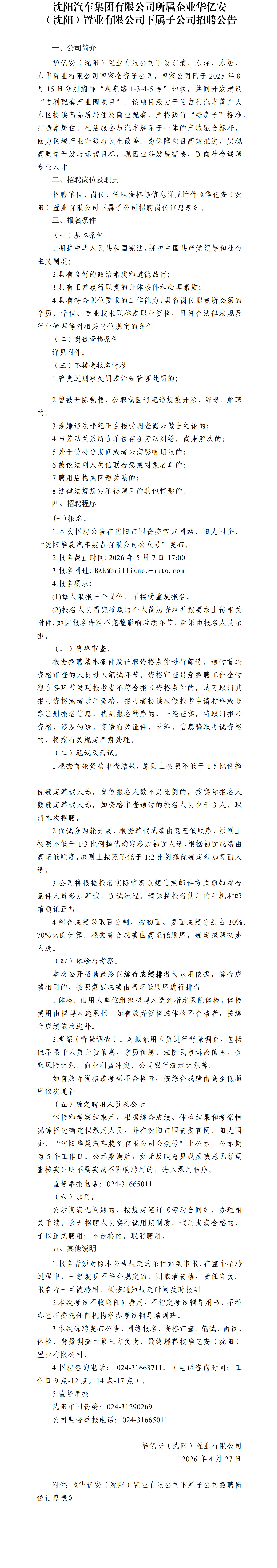 沈阳汽车集团有限公司所属企业华亿安(沈阳)置业有限公司下属子公司招聘公告