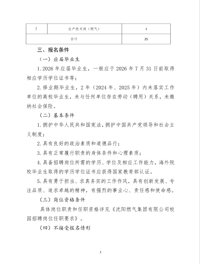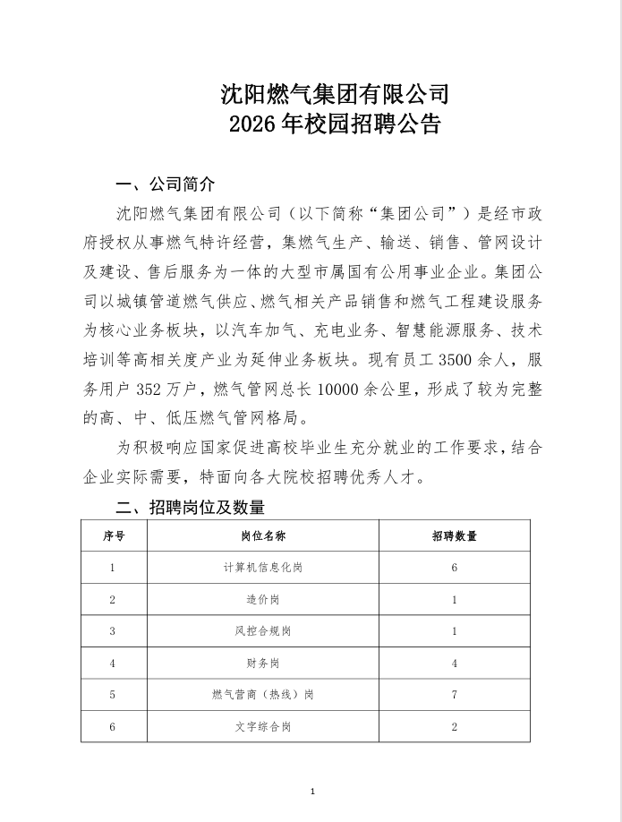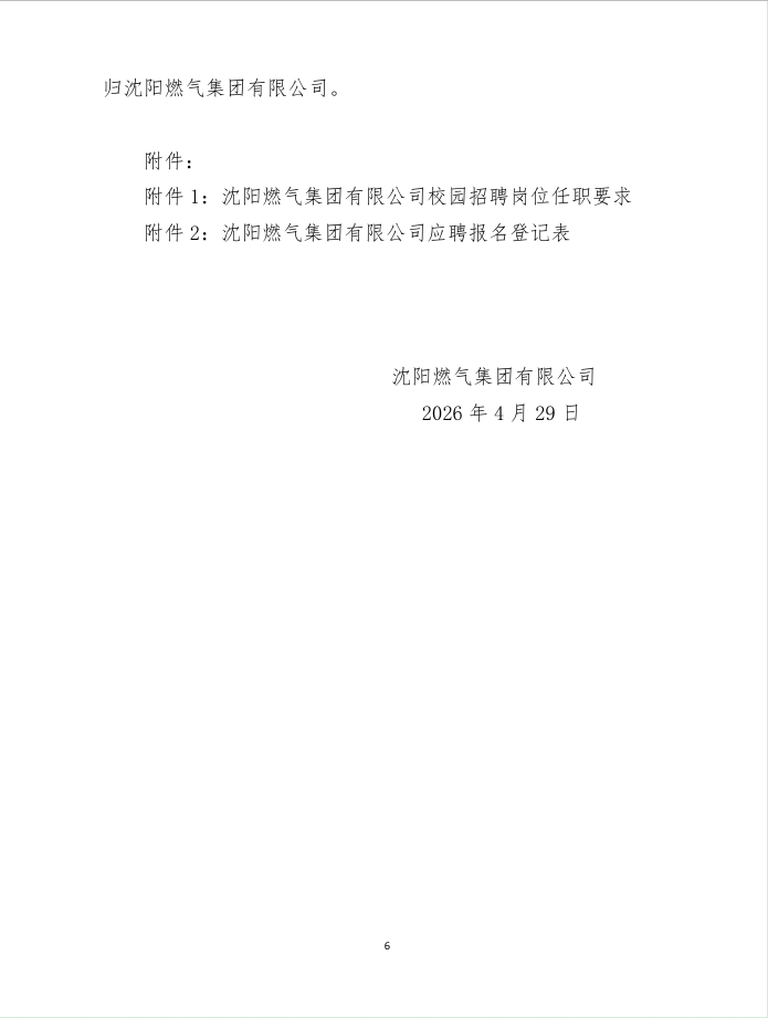 沈阳燃气集团有限公司2026年校园招聘公告 文章来源:沈阳市国资委 发布于:2026-04-29 附件1沈阳燃气集团有限公司校园招聘岗位任职要求.xlsx附件2沈阳燃气集团有限公司应聘报名登记表.xls