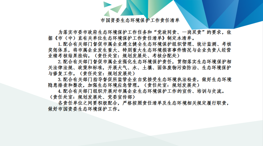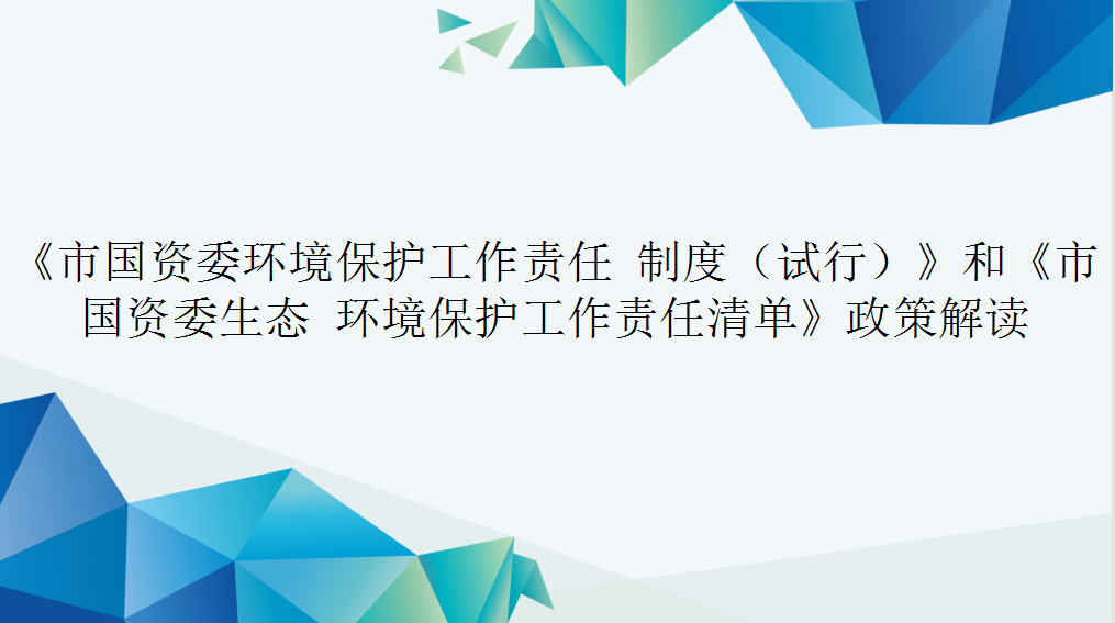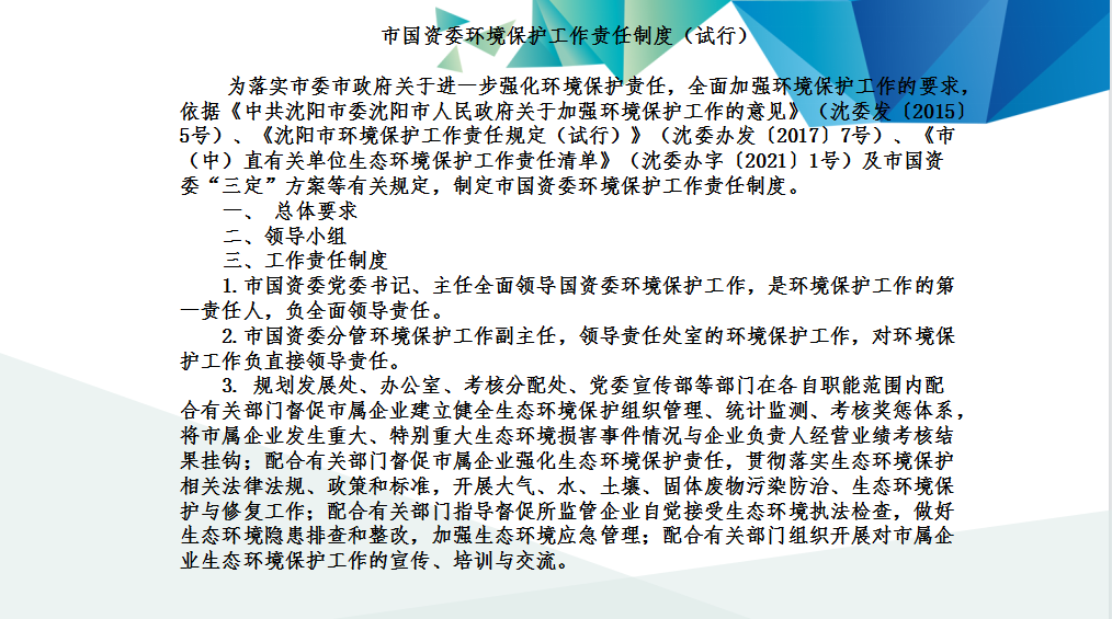 《市国资委环境保护工作责任 制度(试行)》和《市国资委生态 环境保护工作责任清单》政策解读(图解) 文章来源:沈阳市国资委 发布于:2021-11-10 文件链接:关于印发《市国资委环境保护工作责任 制度(试行)...
